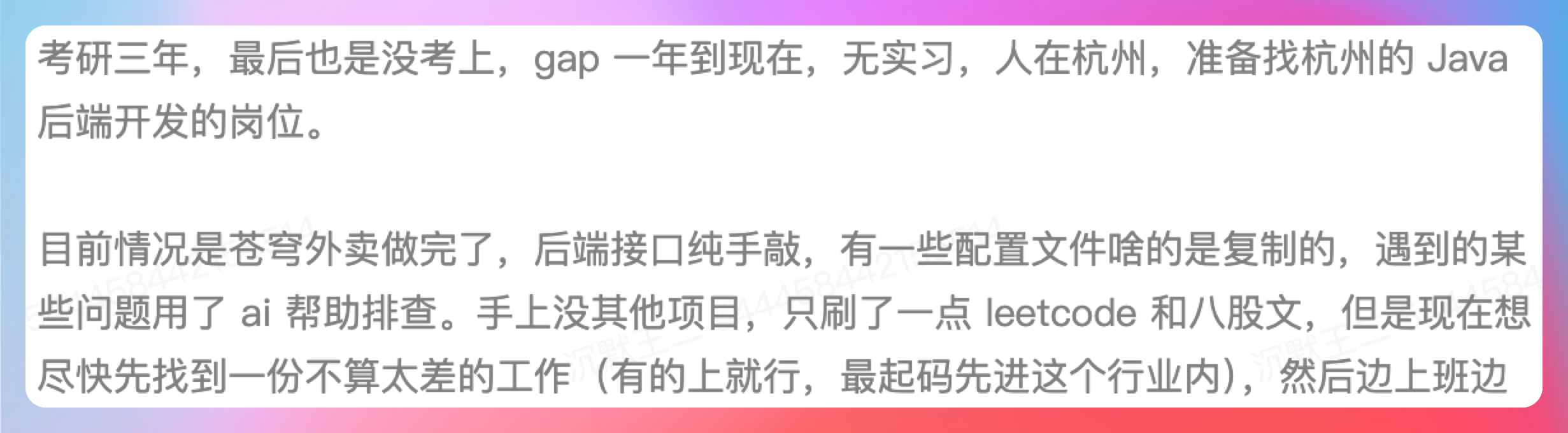 因为有些同学真的会后知后觉,这不,有球友提问说自己 gap 三年,也没有实习,项目只做了苍穹外卖,特别着急,希望能尽快找个工作。