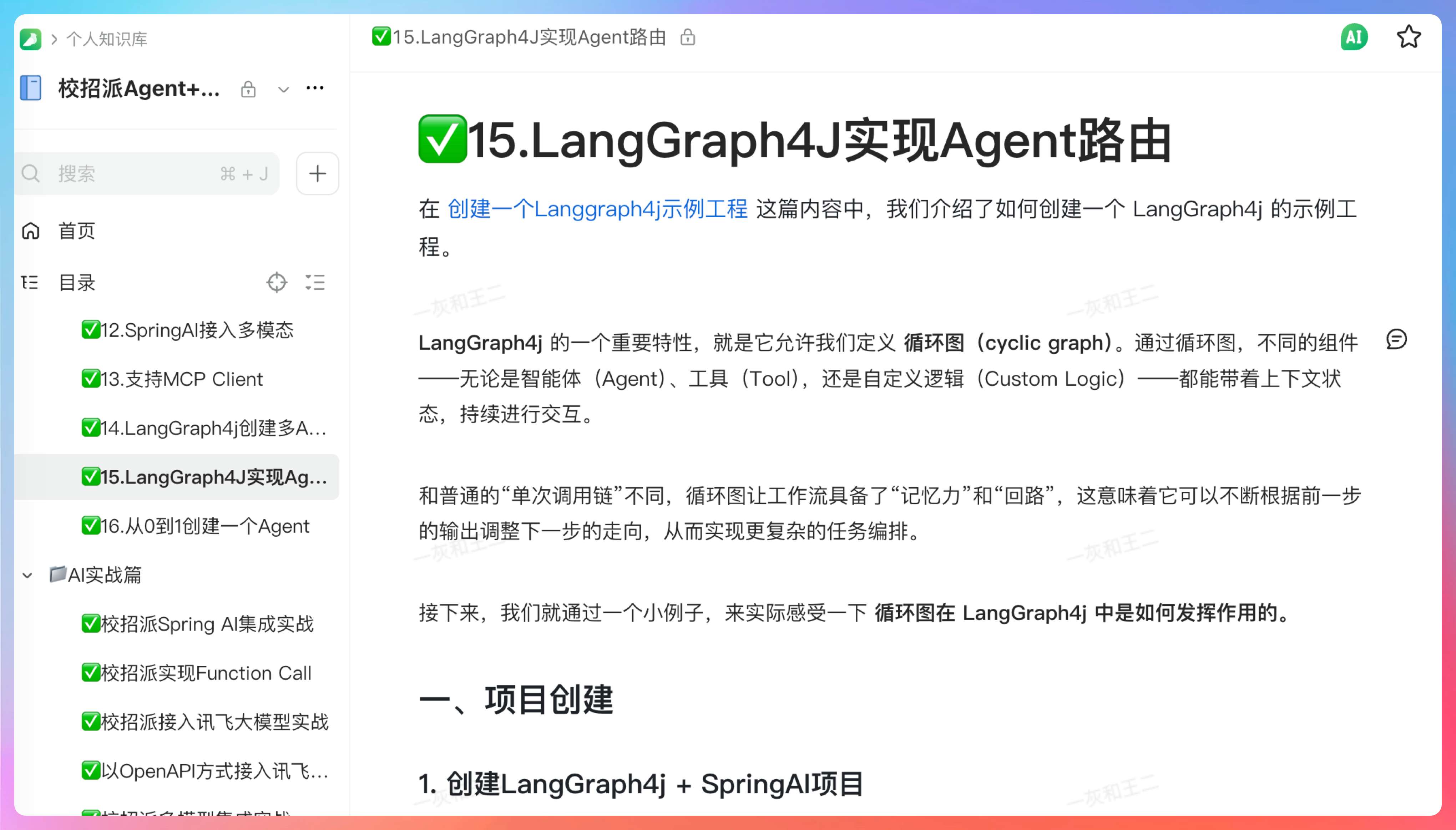 暑期实习/春招前,星球还会上架一个校招派的 Agent+MCP 项目,用的就是 LangGraph4J 实现的 Agent 路由,而框架是用 SpringAI 搭建的。