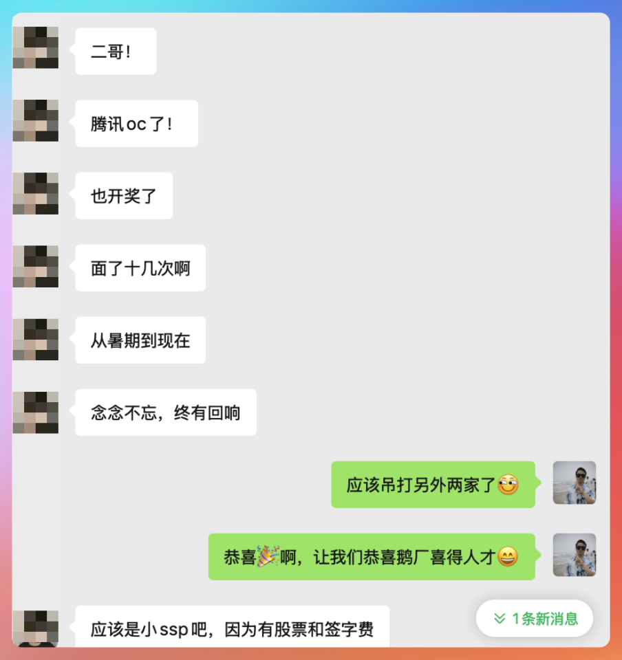 有球友发喜报说,腾讯开了个 SSP,还有股票和签字费,这直接就杀死比赛了呀。从暑期到现在,球友面了十几次,真可谓念念不忘,必有回响啊。