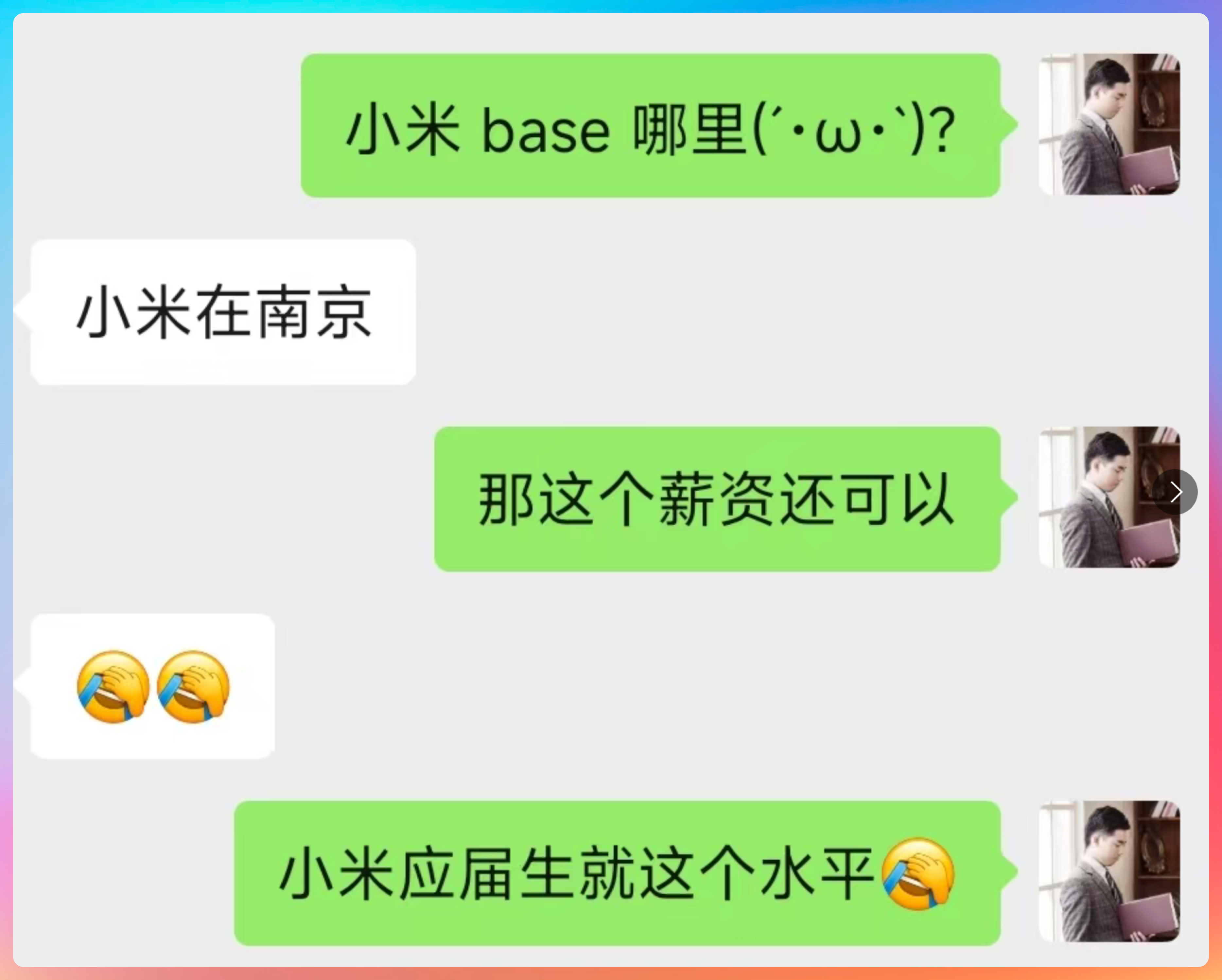 有球友咨询 offer 选择的时候,倾向于小米,然后我就问她 base 地在哪里,说南京,我认为这个薪资还可以;但两个捂脸的表情符号,我懂,我真懂她的意思。
