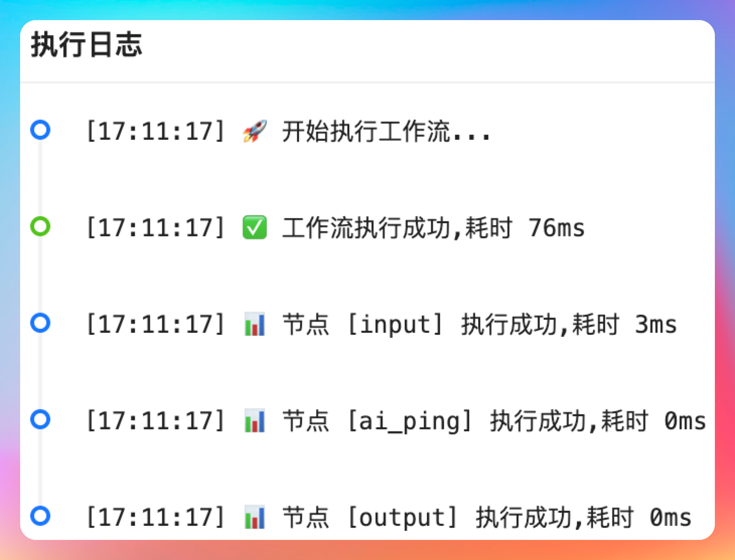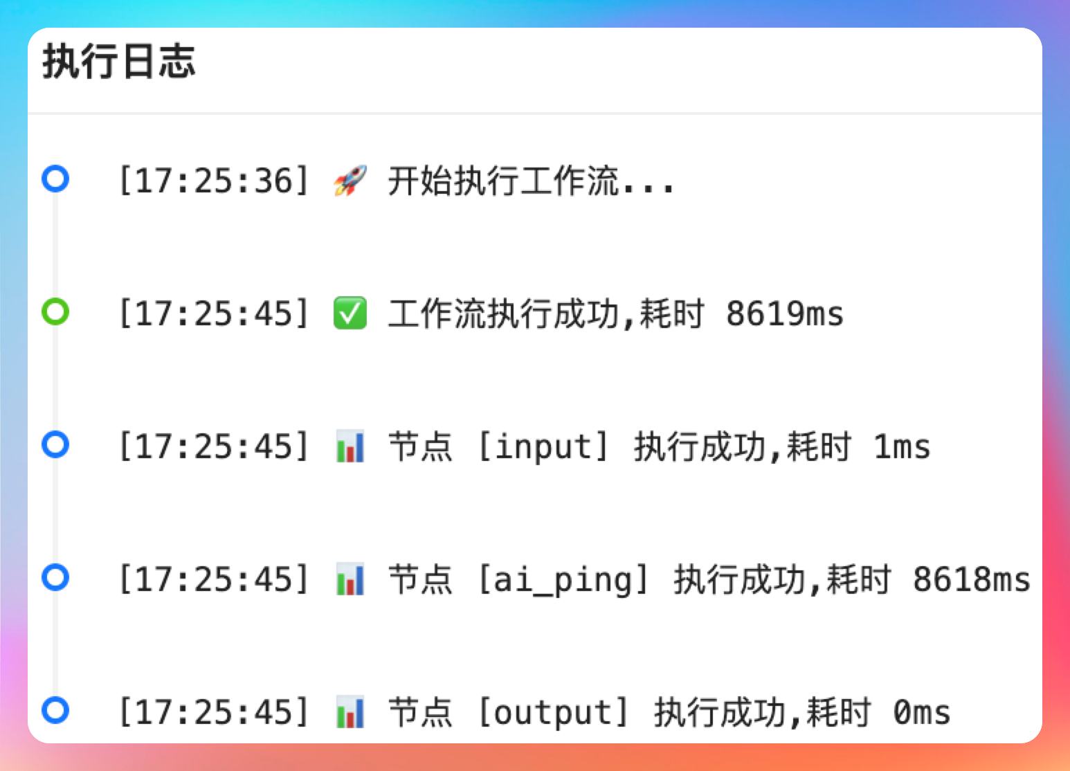 再次运行,发现 AI Ping 节点已经可以正常执行了,这次耗时 8619 毫秒,从时长上判断是没问题的。