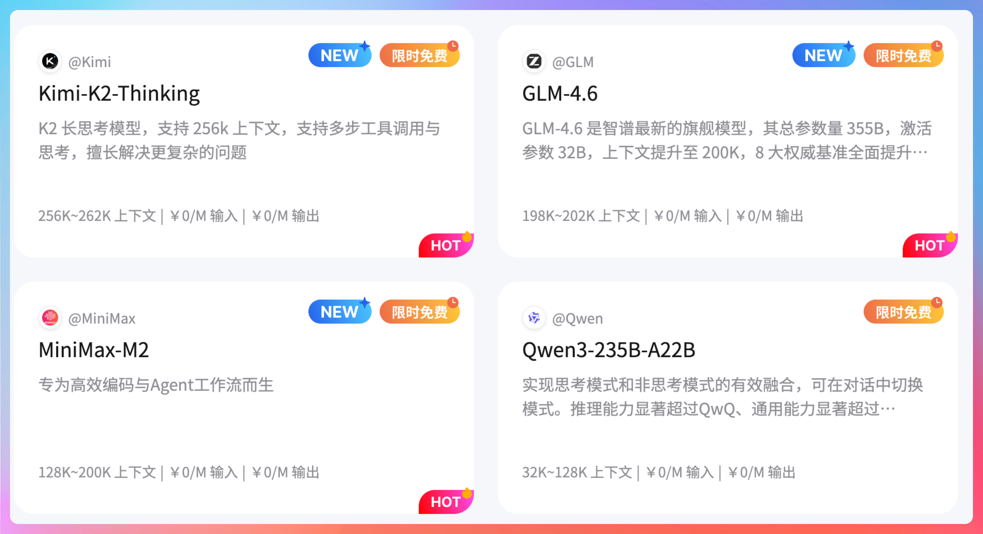 这不重要,重要的是我们可以白嫖他们 3 款主流编程模型:MiniMax-M2、GLM-4.6、Kimi-K2-Thinking、Qwen3-235B-A22B。哈哈哈。