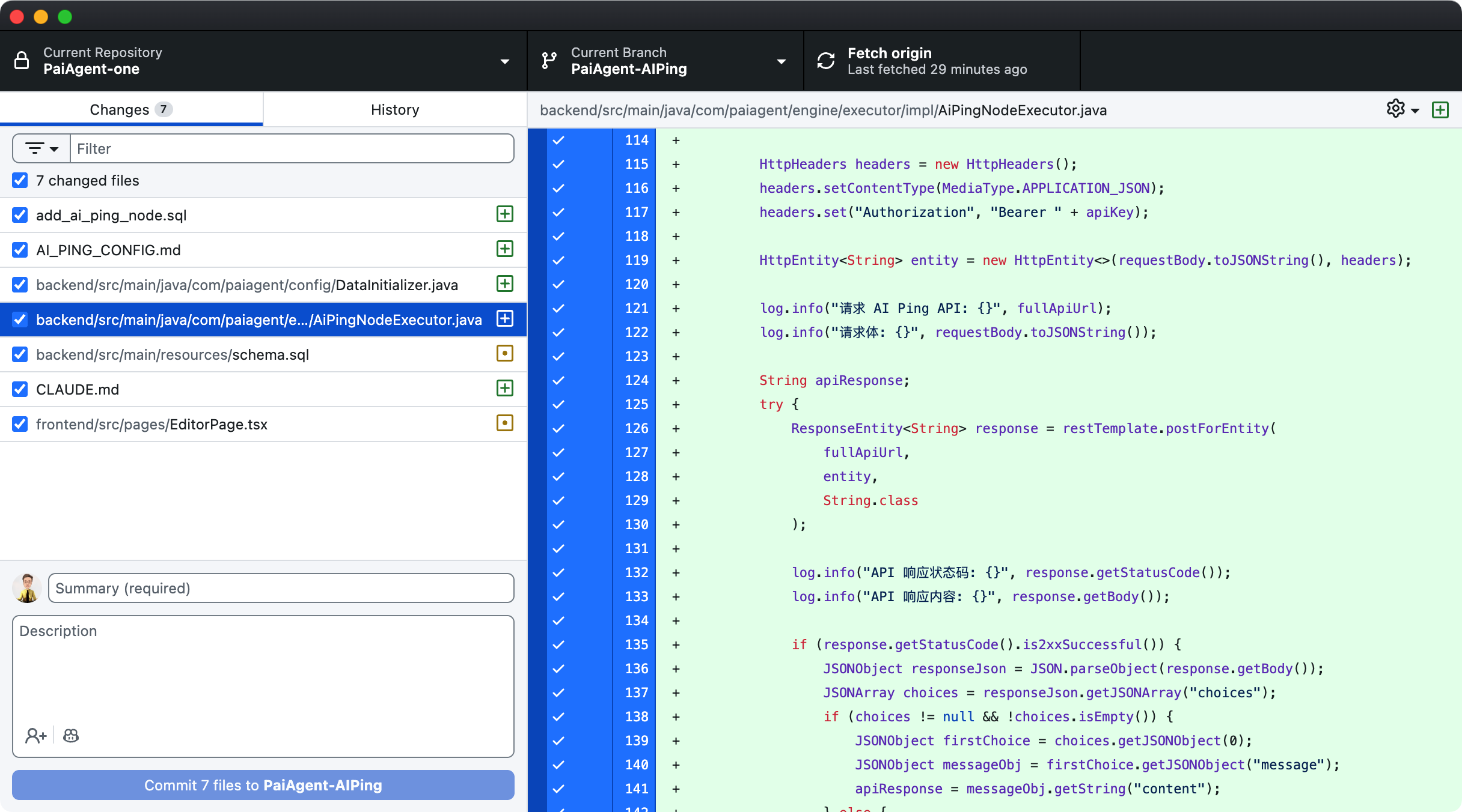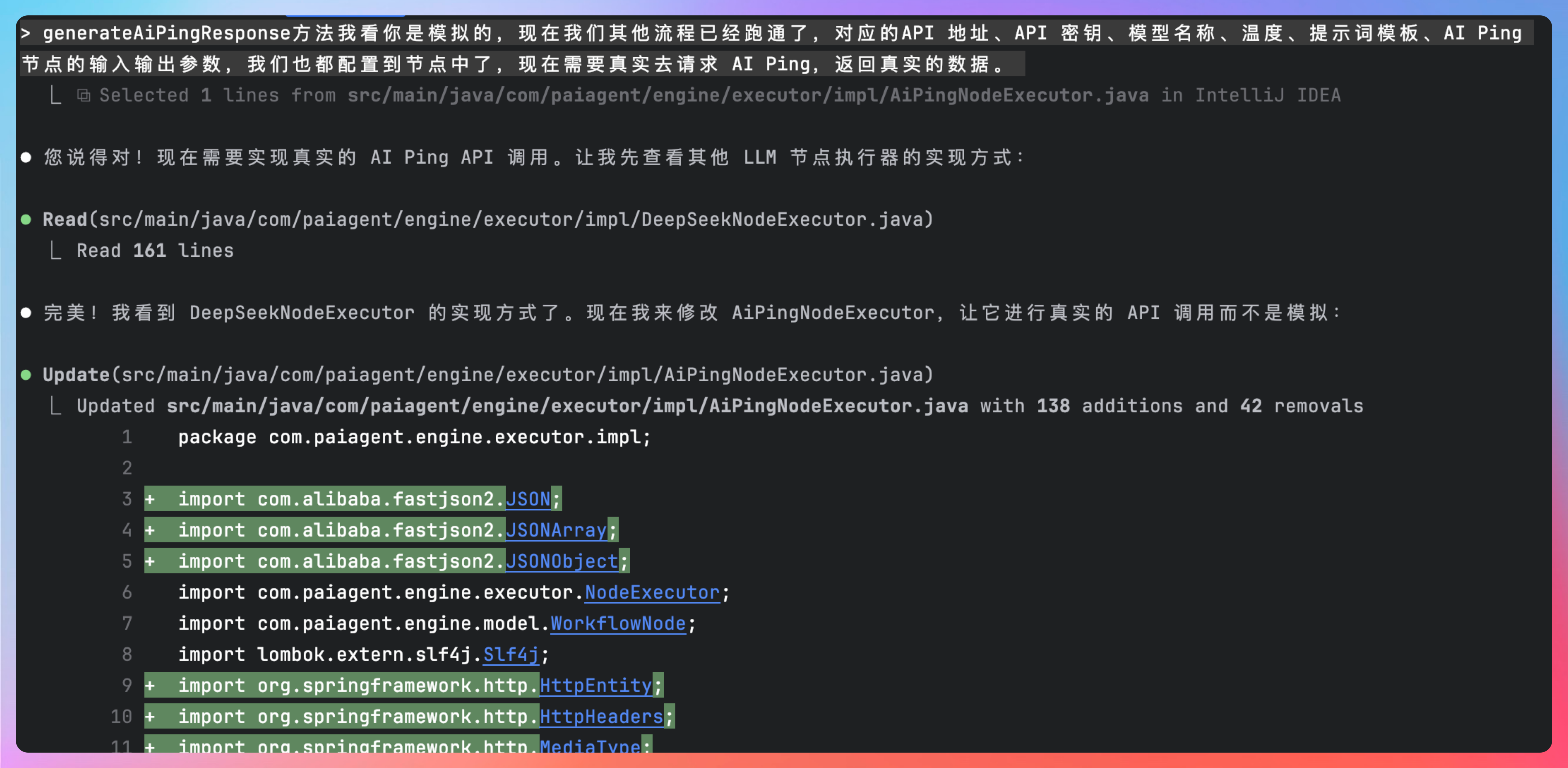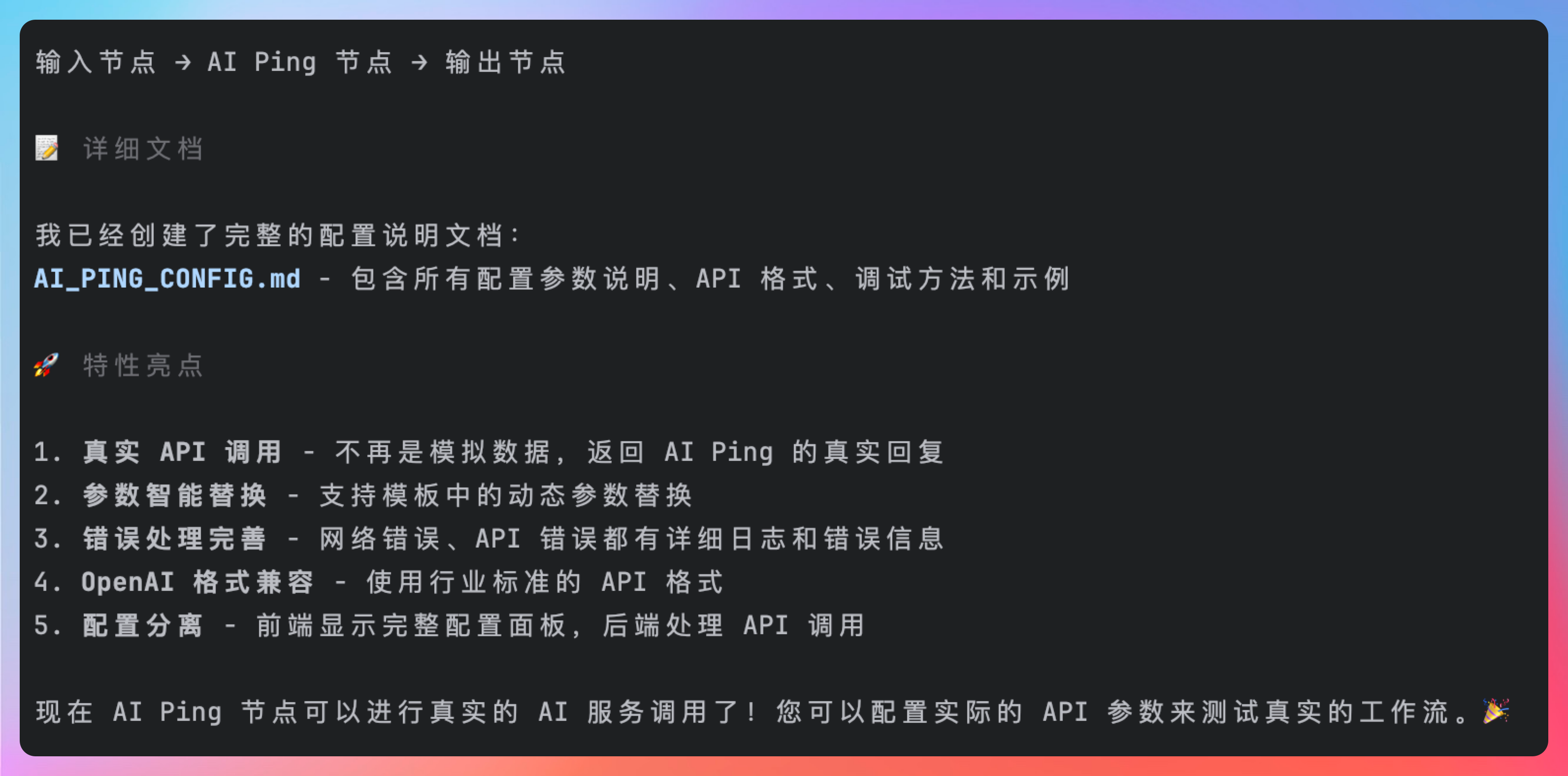 generateAiPingResponse 方法我看你是模拟的,现在我们其他流程已经跑通了,对应的 API 地址、API 密钥、模型名称、温度、提示词模板、AI Ping 节点的输入输出参数,我们也都配置到节点中了,现在需要真实去请求 AI Ping,返回真实的数据。