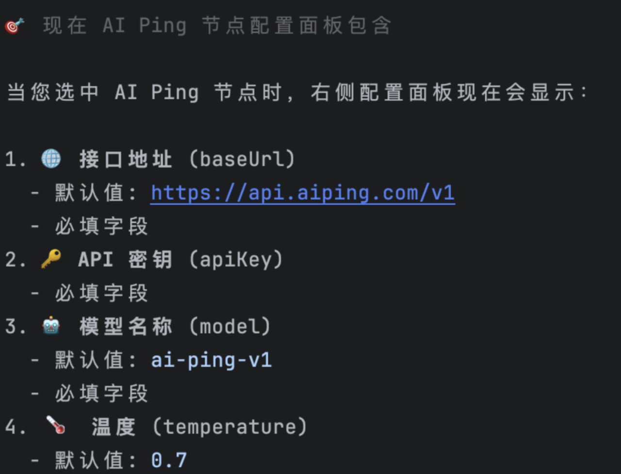 当选中 AI Ping 节点的时候,我们需要为该节点配置一些基本信息,第一个是模型的接口地址,第二个是 API 密钥,第三个是温度,也就是目前已经存在的,第四个参数是模型的 model 名