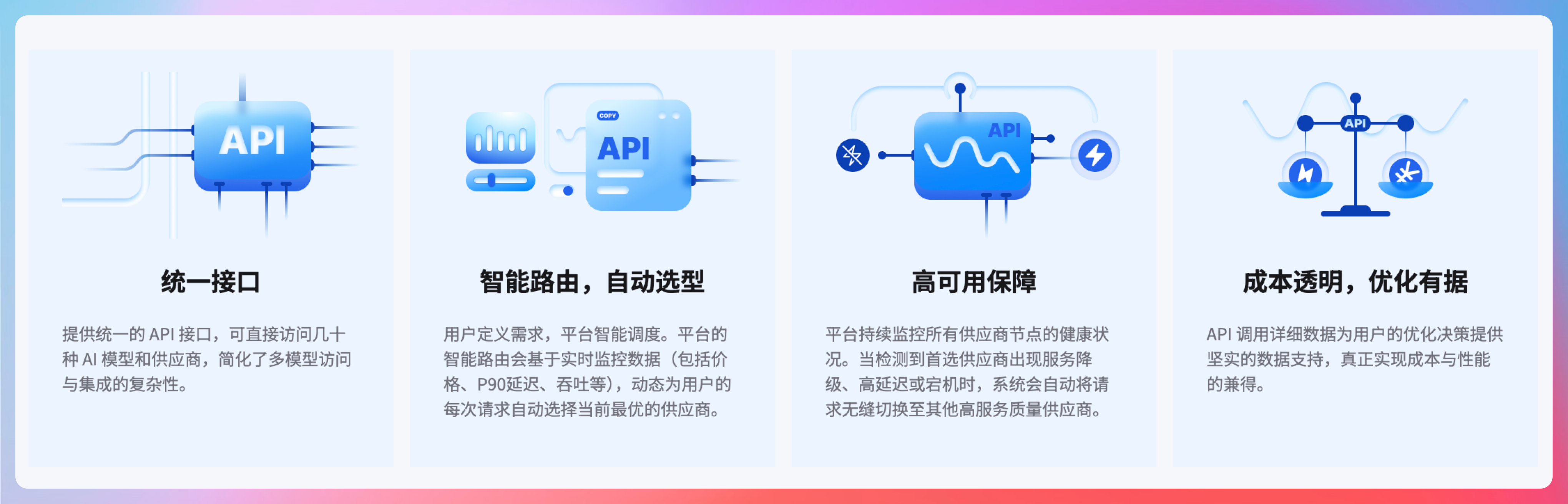 它不只是简单地“帮你把多个模型整成一个接口”这么粗暴,而是把模型路由、性能优选、稳定性兜底这些底层脏活累活都帮你干了。