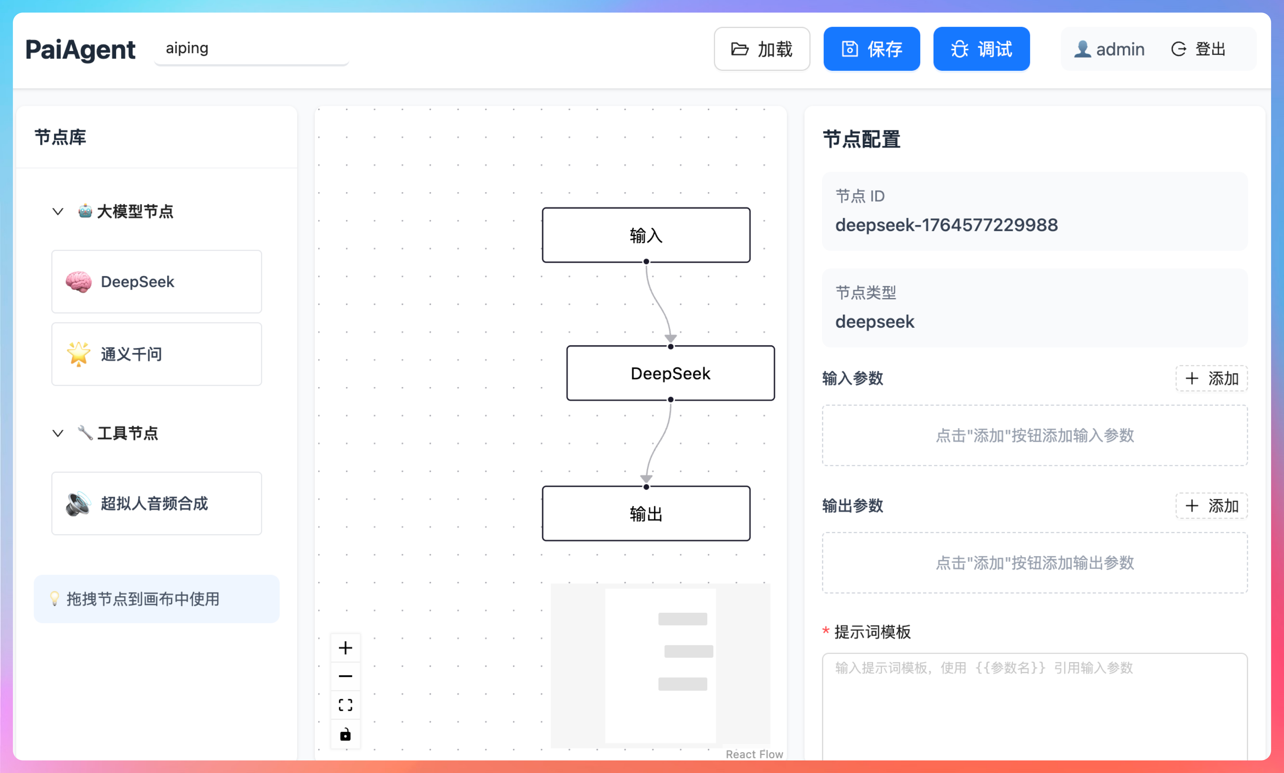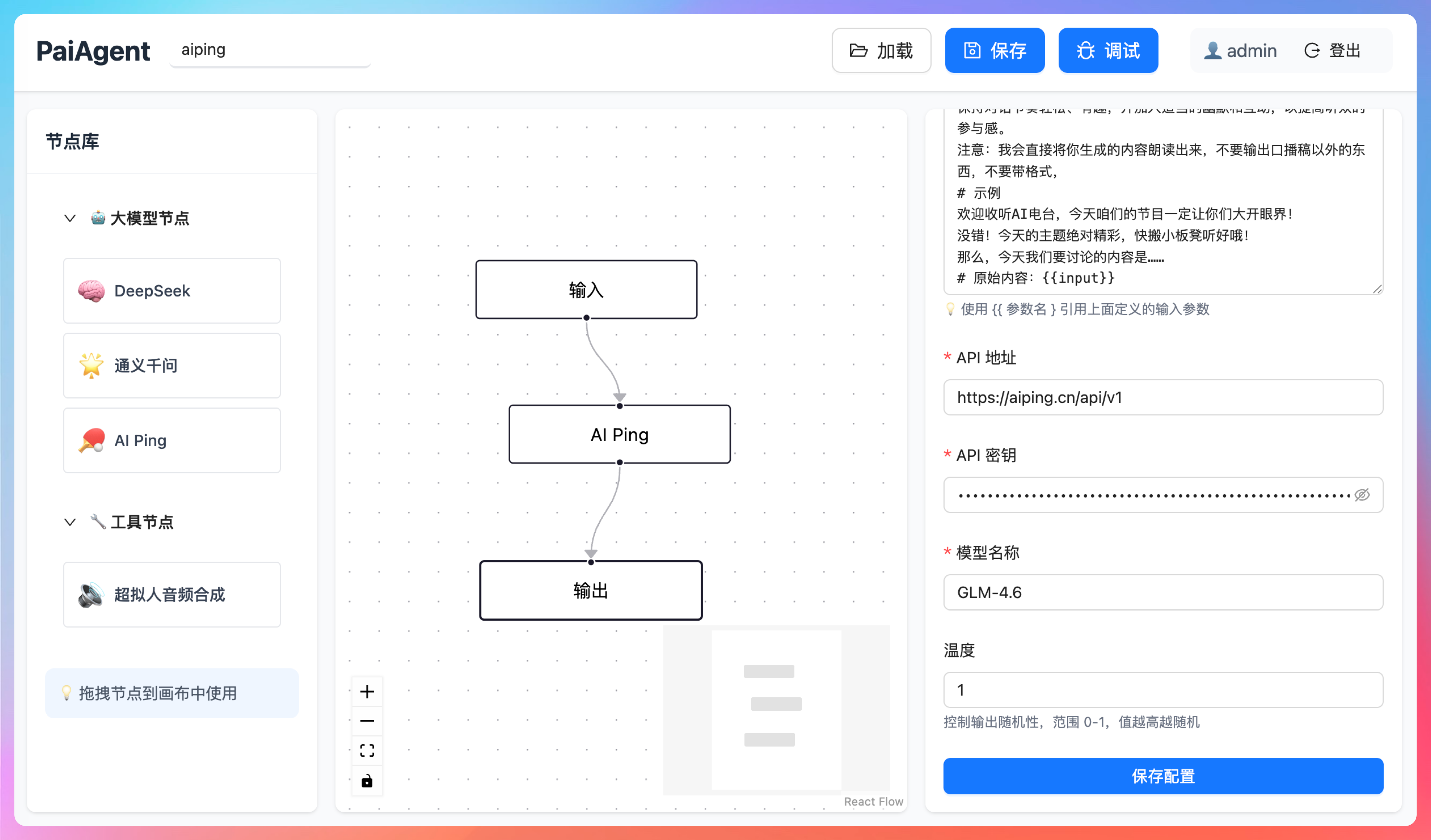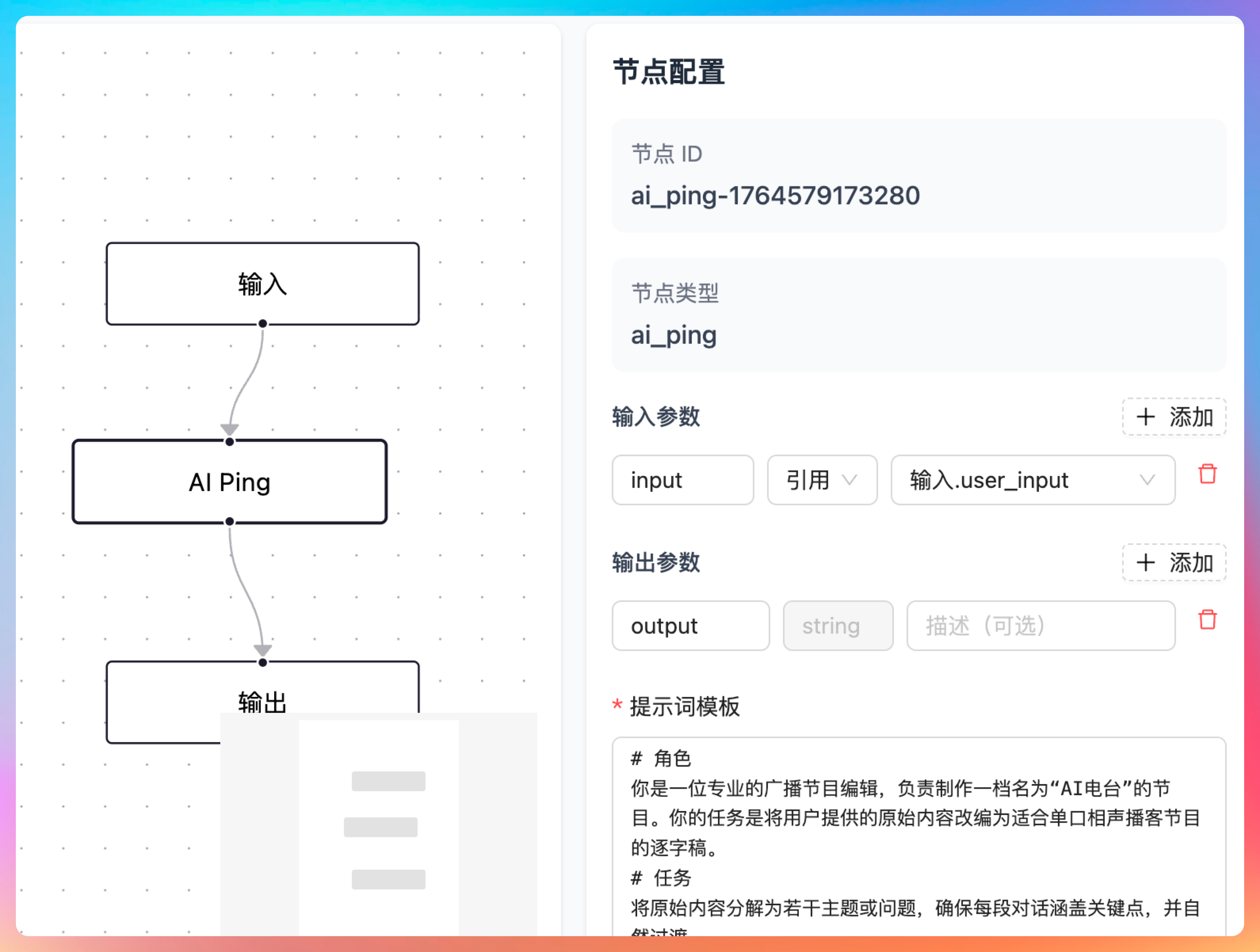 刚好我手头正在做一个 Agent 项目,一个能够拖拉编排工作流的 AI 项目,目前已经完成了输入 → LLM 节点 → 超拟人音频合成 → 输出的一个单项工作流。