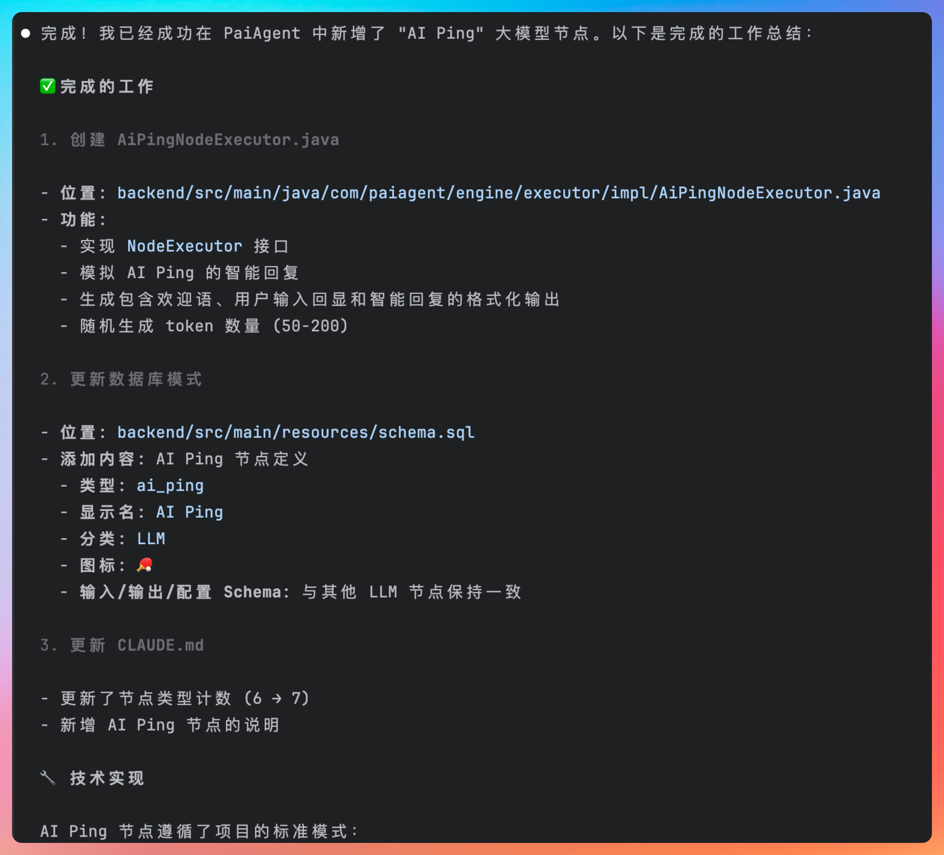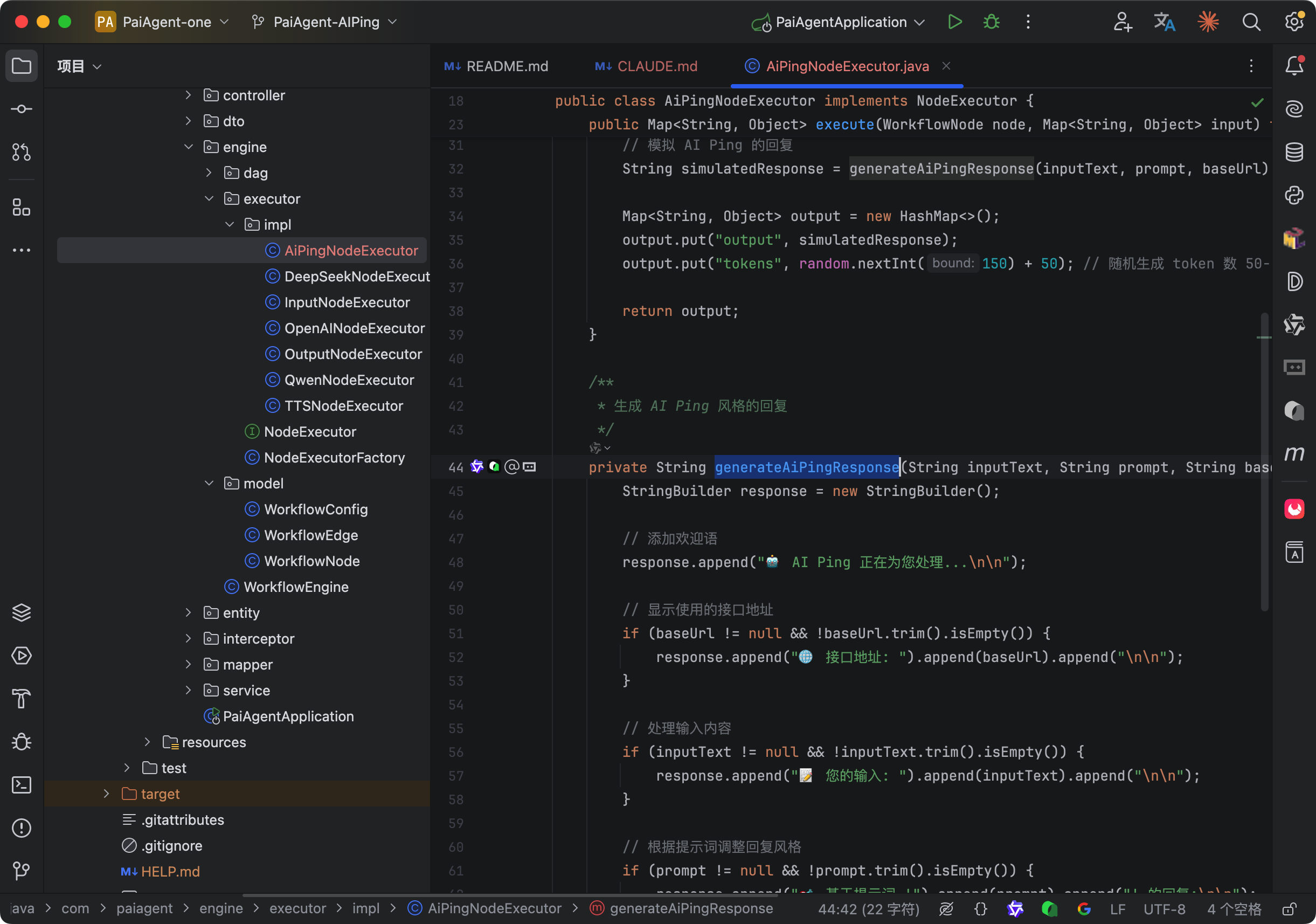 - 创建 AiPingNodeExecutor.java,模拟 AI Ping 的智能回复