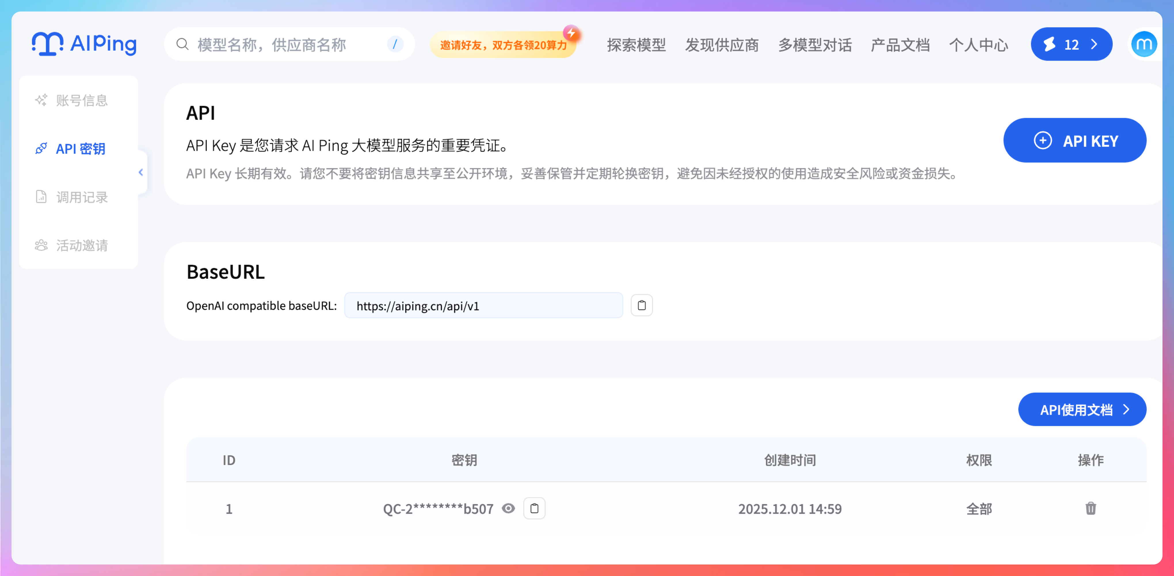 注册了 AI Ping 后,可以在控制台这里看到自己的 API 密钥。