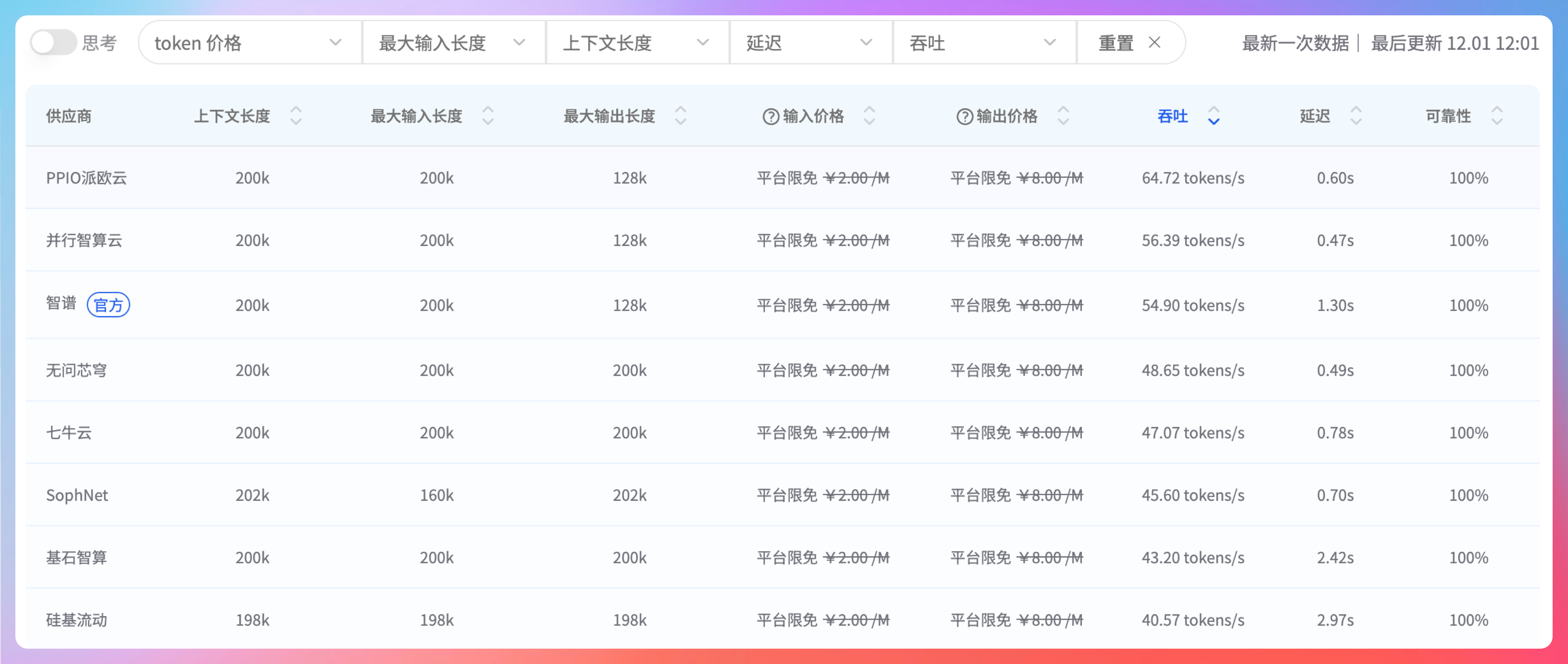 这就和 AI Ping 的模型供应商智能路由对上号了呀。哪个服务厂商的吞吐大、延迟低、可靠性强,就选择哪一个。