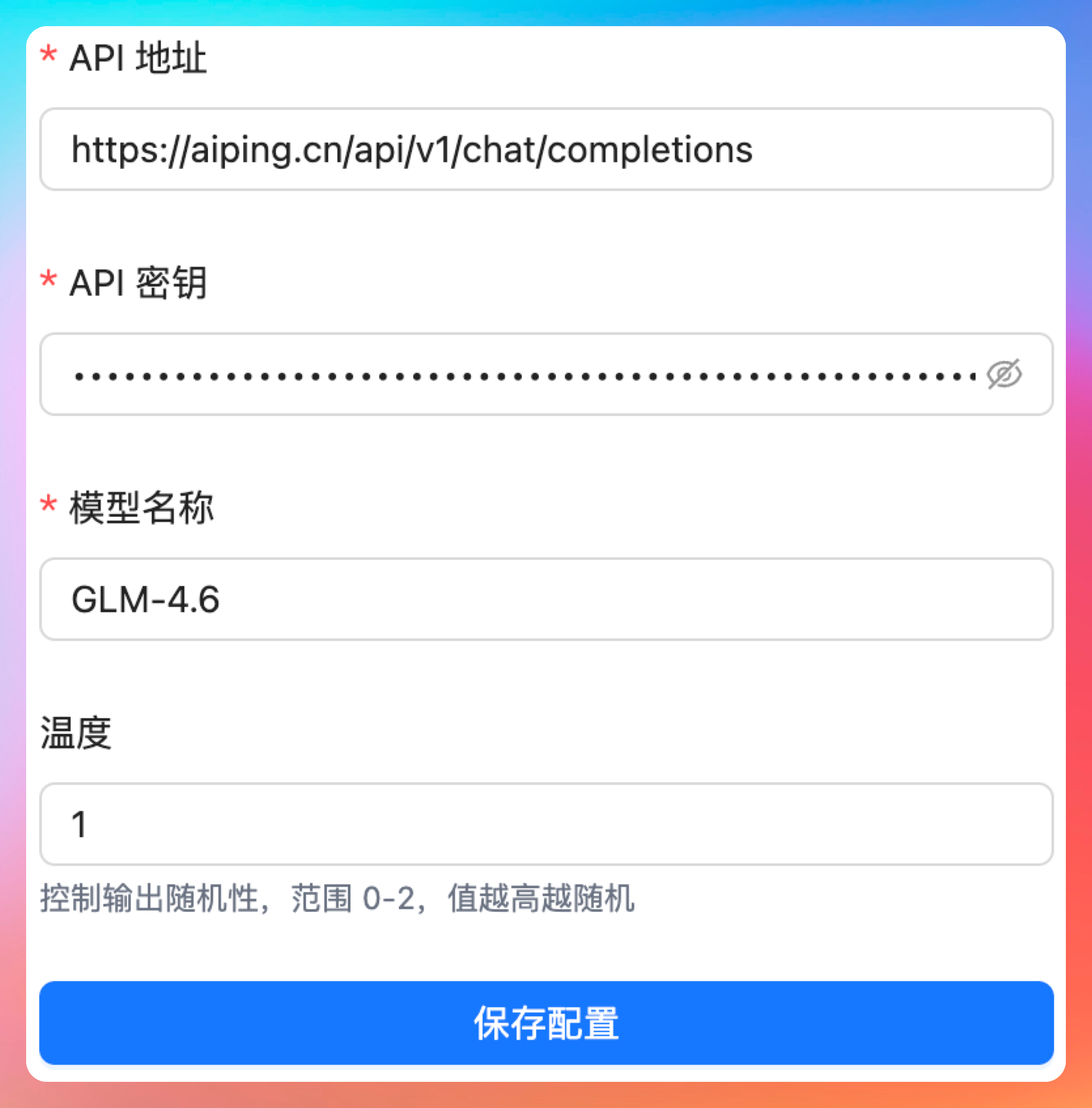 然后是 API 地址,我们填写 https://aiping.cn/api/v1/chat/completions,接着是 API 密钥,然后是模型名称,这次我们选择”GLM-4.6“,温度我们就填 1。