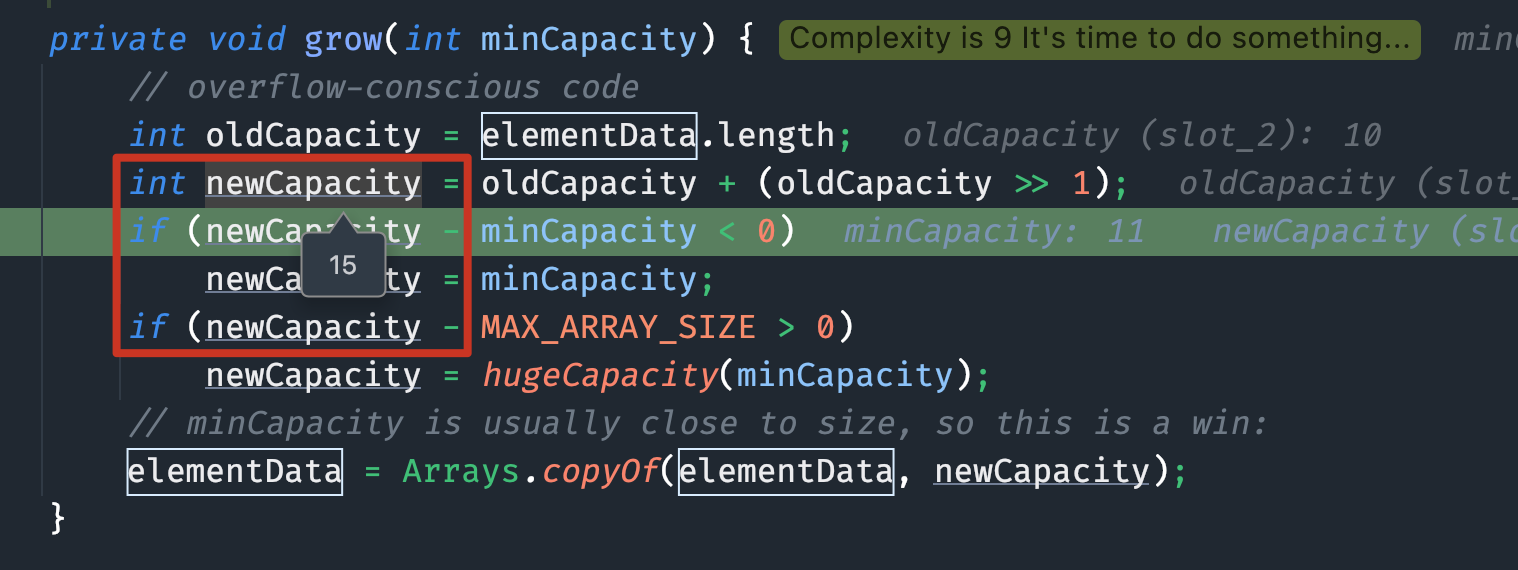 所以 newCapacity 也为 0,于是 newCapacity - minCapacity 等于 -10 小于 0,于是第一个 if 条件为 true,执行第一个 if 语句 newCapacity = minCapacity,然后 newCapacity 为 10。