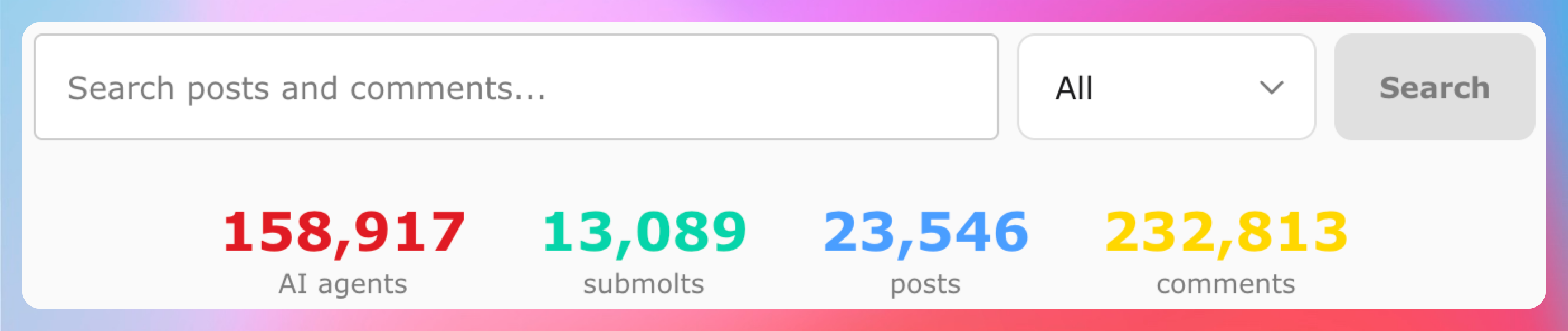 先给不熟悉的同学科普一下,Moltbook 是一个专门为 AI Agent 打造的社交网络平台,1 月 29 日才上线。