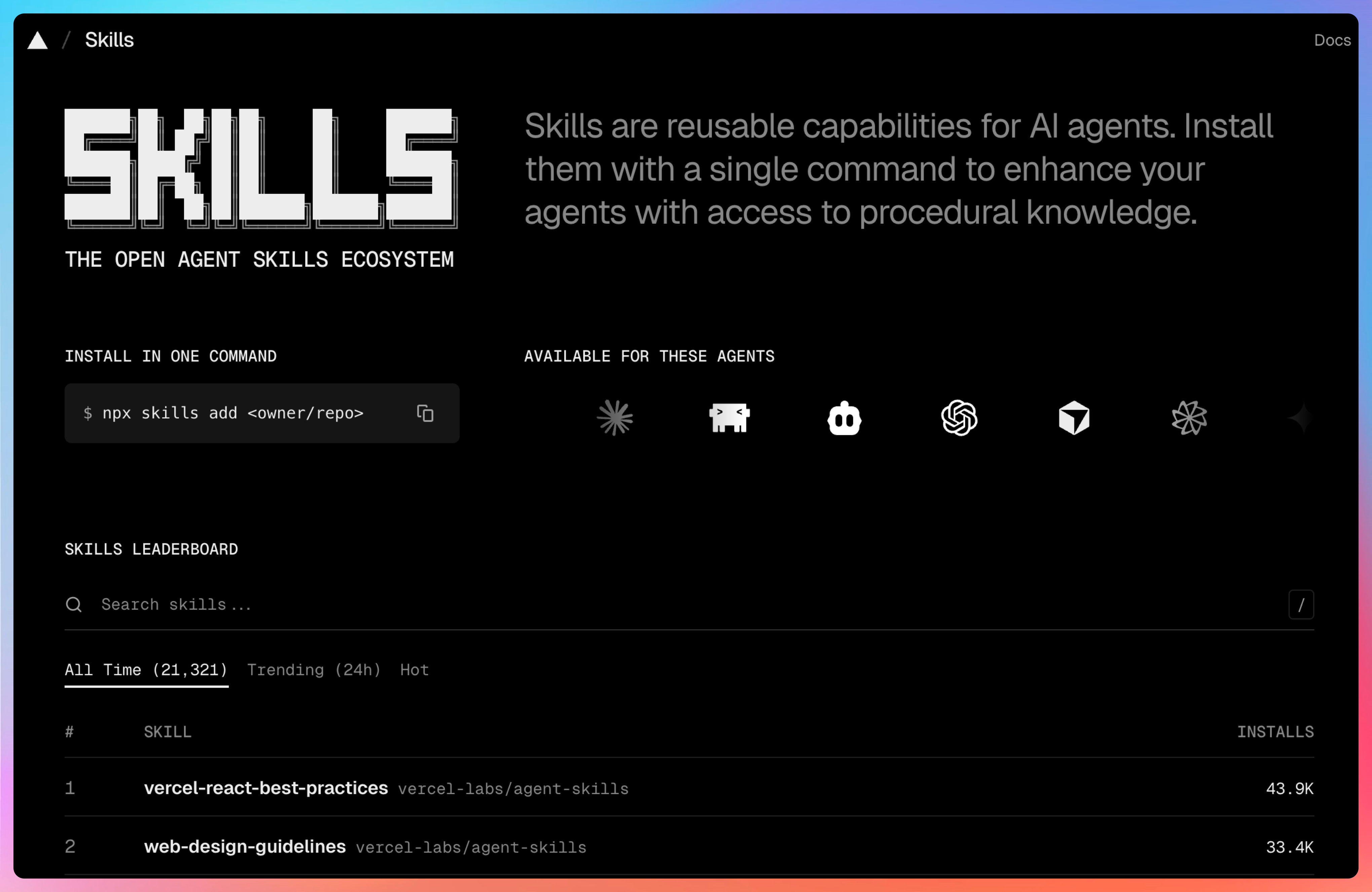Skills 是一套 AI 智能体技能,主打一个"可复用的程序化知识"。说白了,就是把某个领域的专业经验打包成 Skill,其他人可以一键安装使用,不用从头摸索。