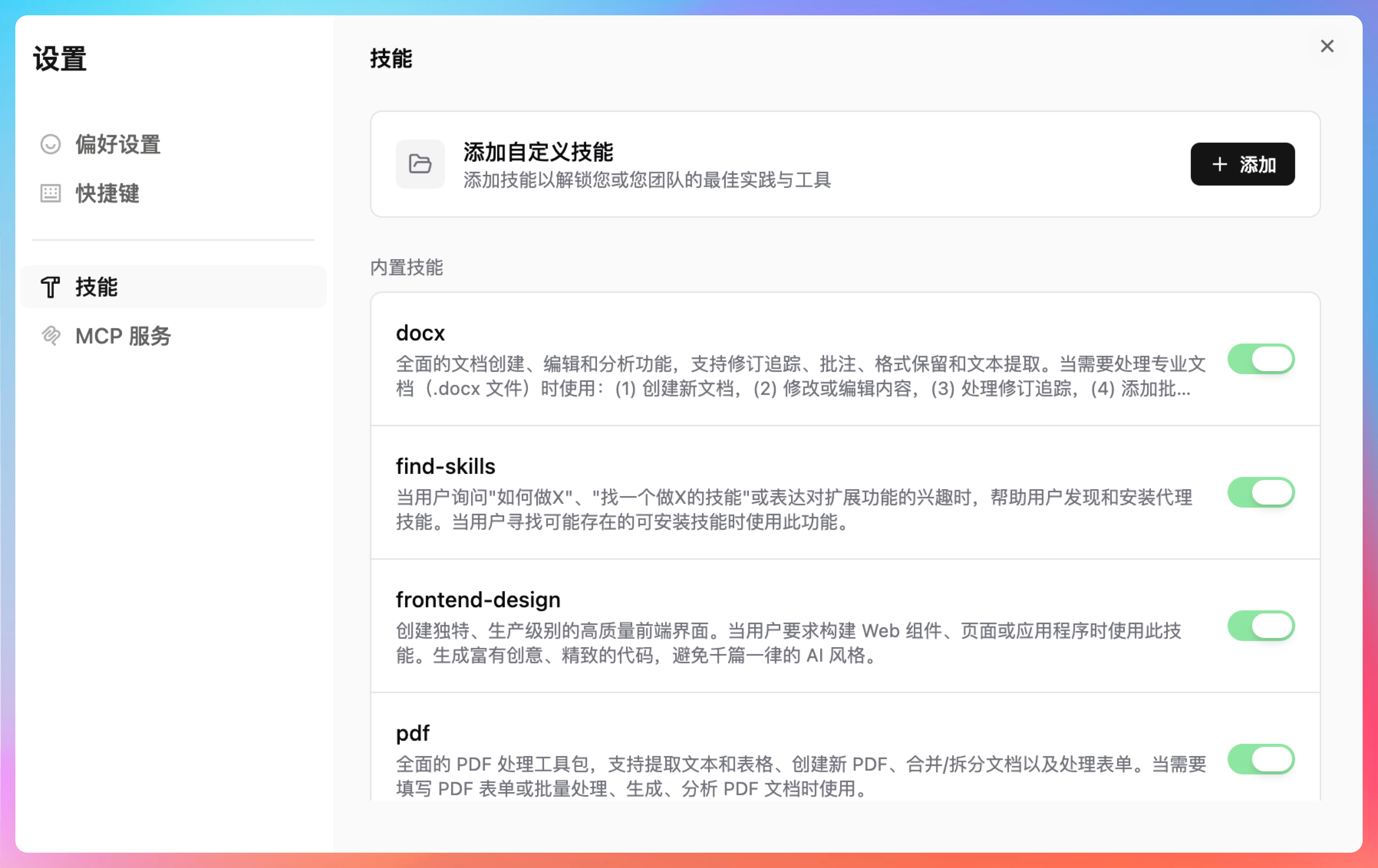 点左下角头像,选择设置,再点技能,就能看到 Skills 管理界面了。