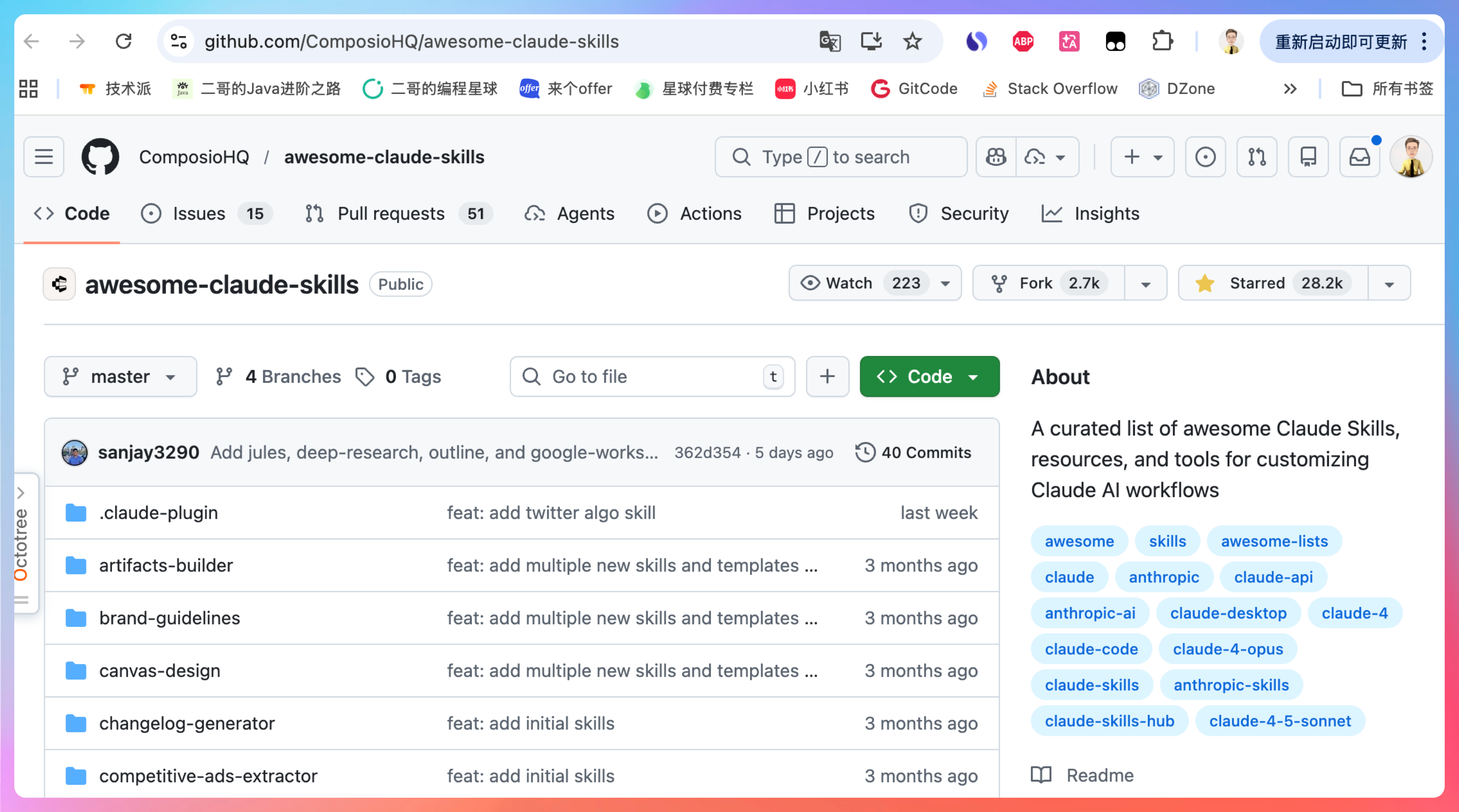 除了 skills.sh 这样的第三方平台,GitHub上也有很多类似的开源 Skill 仓库。