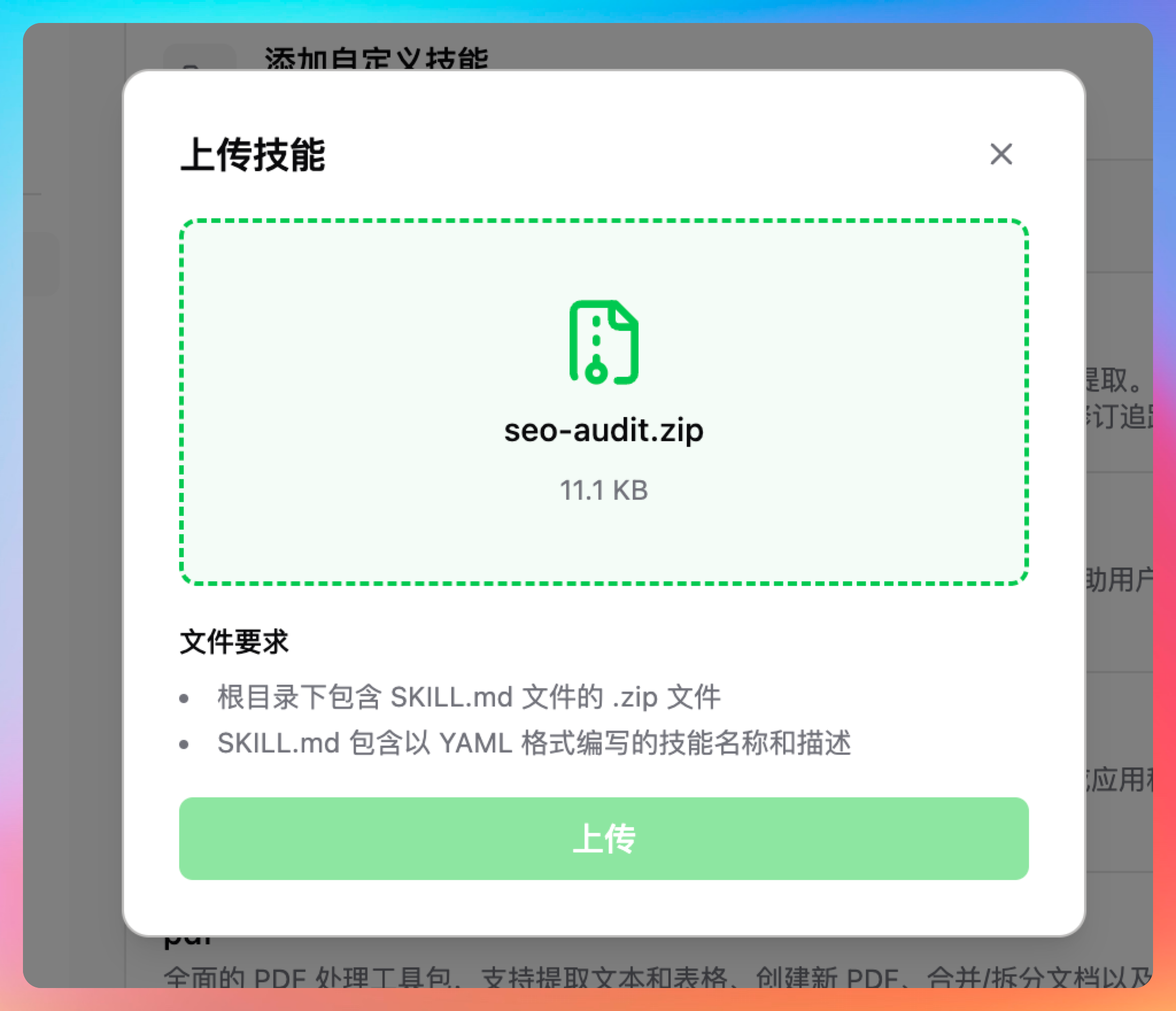 然后在自定义Skills这里选择我们刚刚压缩的技能包,点【上传】就行了。