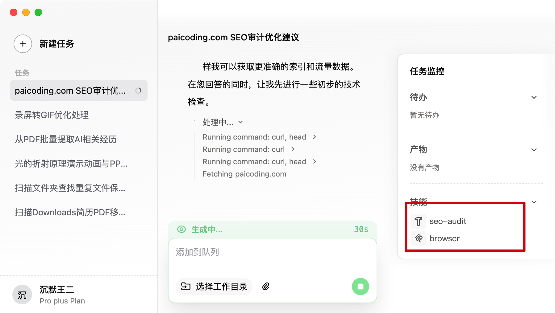 好,我们回到QoderWork的主界面,甩给它一句指令:"@seo-audit 帮我检查 paicoding.com 的 SEO 情况,给出优化建议"。