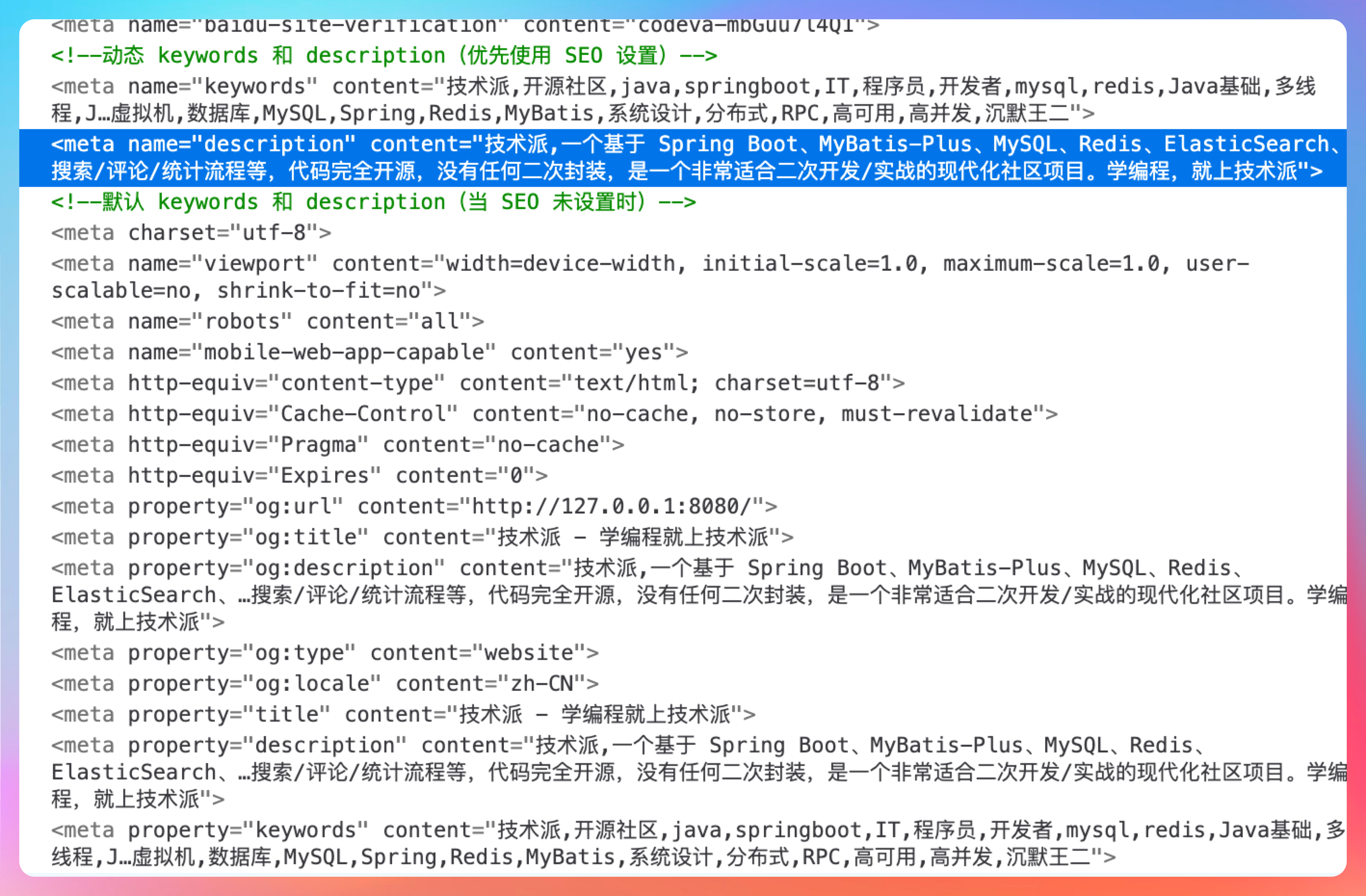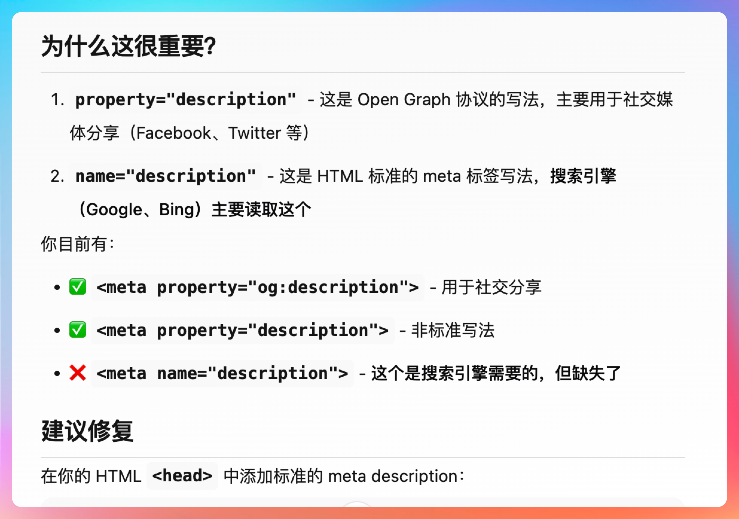 后面服务更新我自测一下。还有关于这个首页缺少 meta description - 失去了在搜索结果中吸引用户的重要机会,我一开始不理解为什么,因为我查了一下,网站是有 description 标签的。