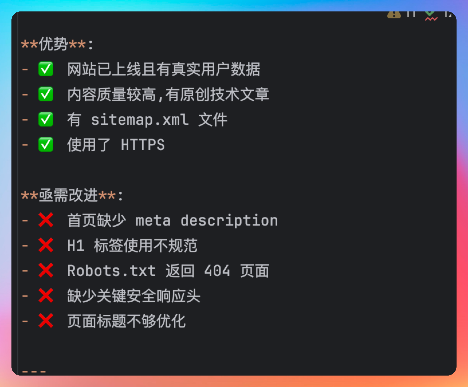 你们猜猜怎么着?它真的像个 SEO 专家一样,从多个维度分析了我的网站。