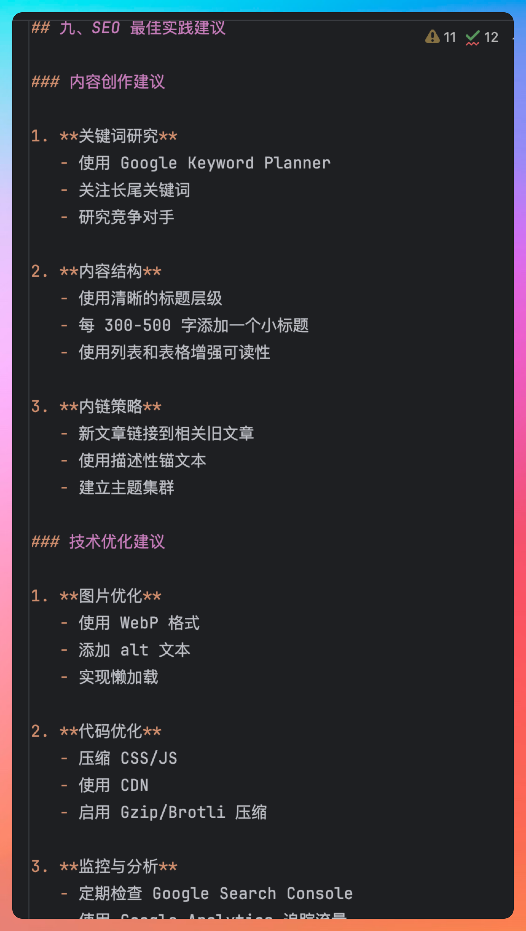 然后是内容层面,分析了标题标签、描述标签、关键词密度、H1-H6 标签结构、图片 alt 属性等等。