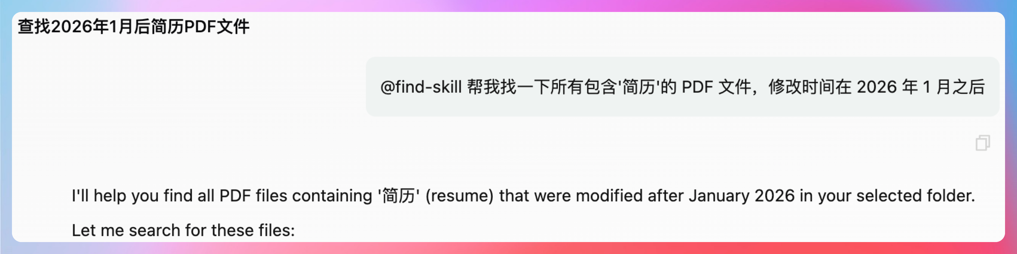 这次我直接甩给 QoderWork 一句指令:"@find-skill 帮我找一下所有包含'简历'的 PDF 文件,修改时间在 2026 年 1 月之后"。