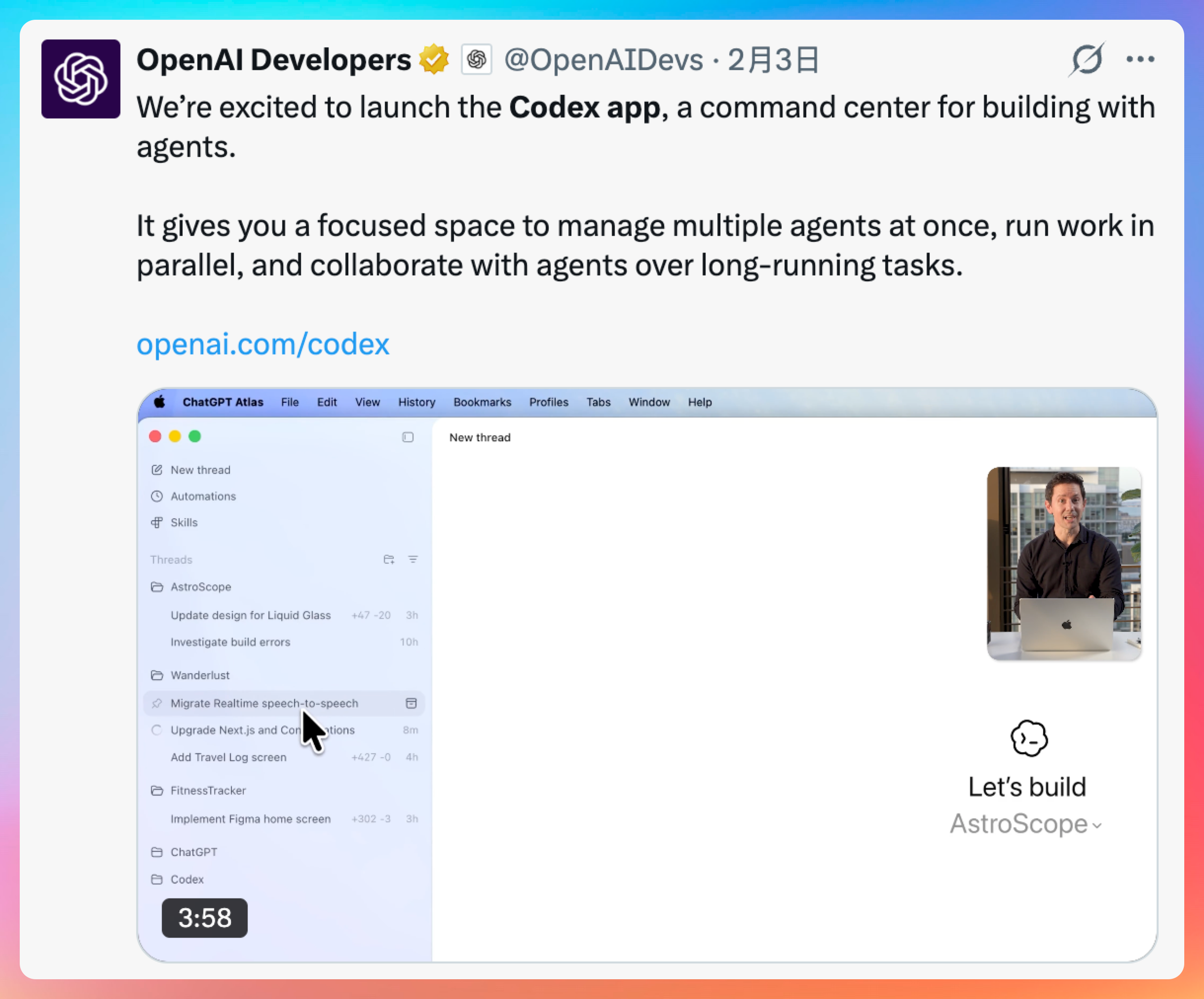 2026年2月3日凌晨,OpenAI搞了个大动作。Codex App桌面端应用正式发布。