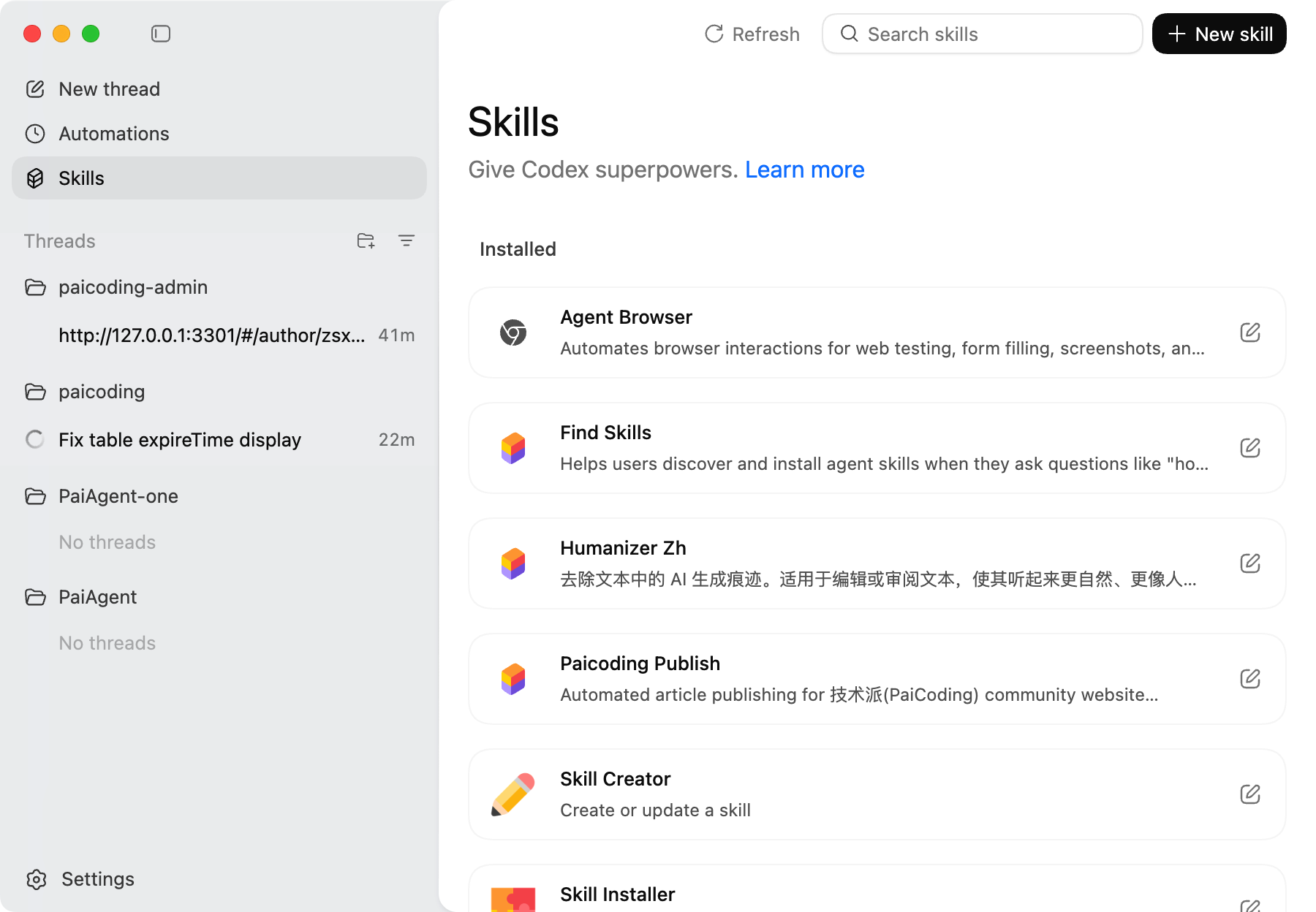 Codex CLI 时代的 Skills 是通过配置文件定义的,对新手不太友好。现在桌面版直接把 Skills 做成了可视化的界面。