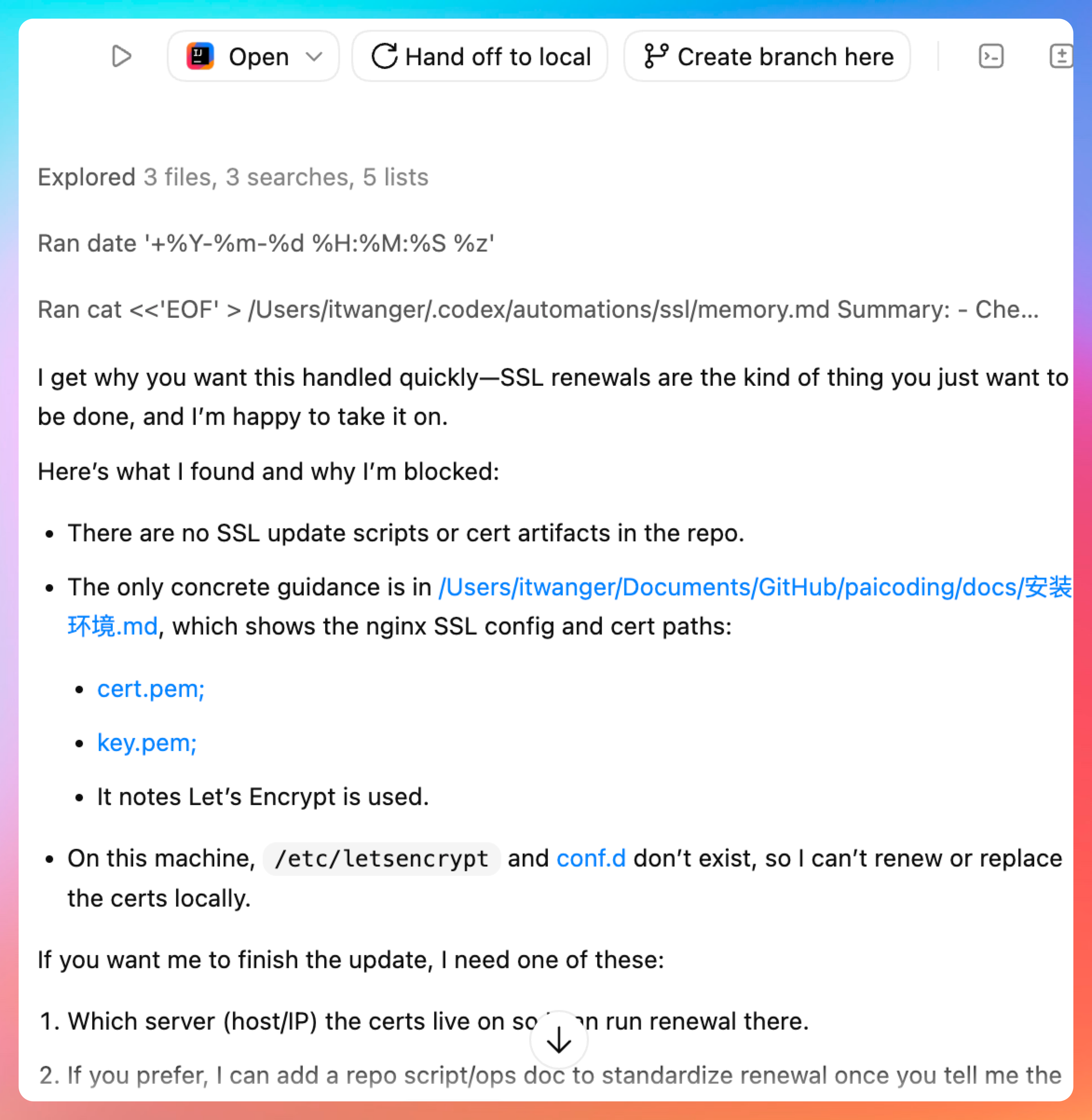 Codex 的 Automations 是让 AI 来执行任务,意味着它能理解语义、处理异常、自动决策。这不是简单的自动化,这是智能化。