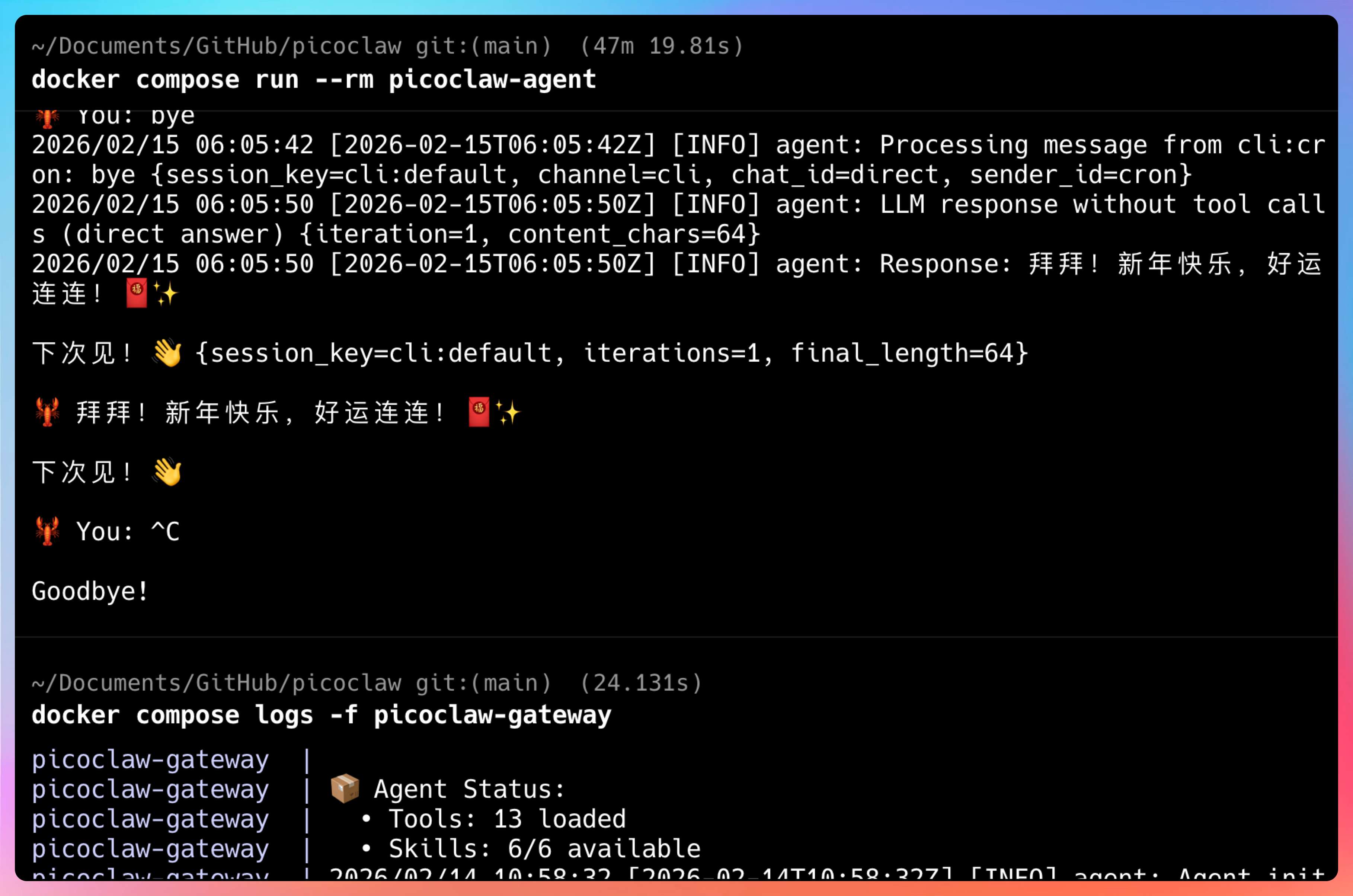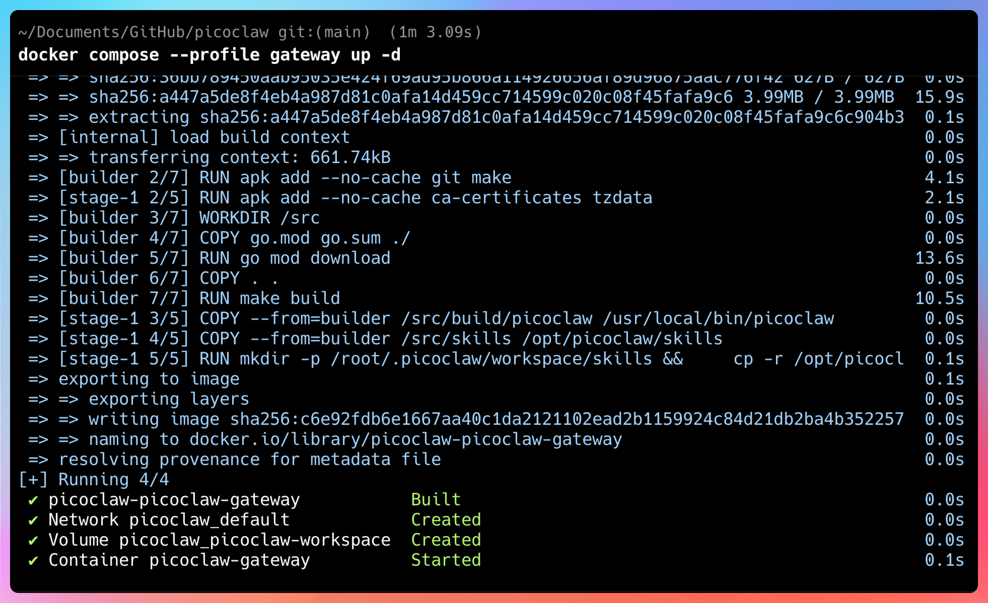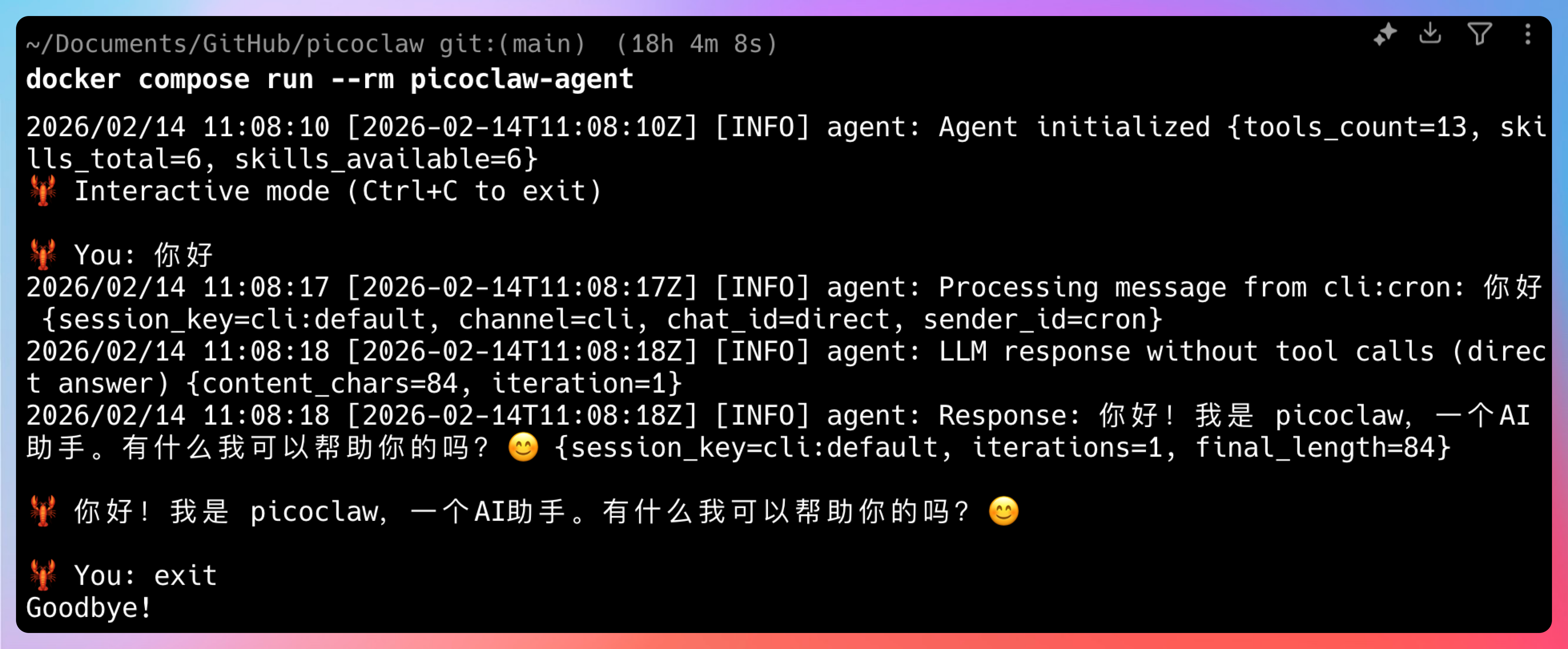 说再多不如动手试试。PicoClaw 的安装方式有多种,我这里选择的是Docker,环境依赖最少,适合快速上手。