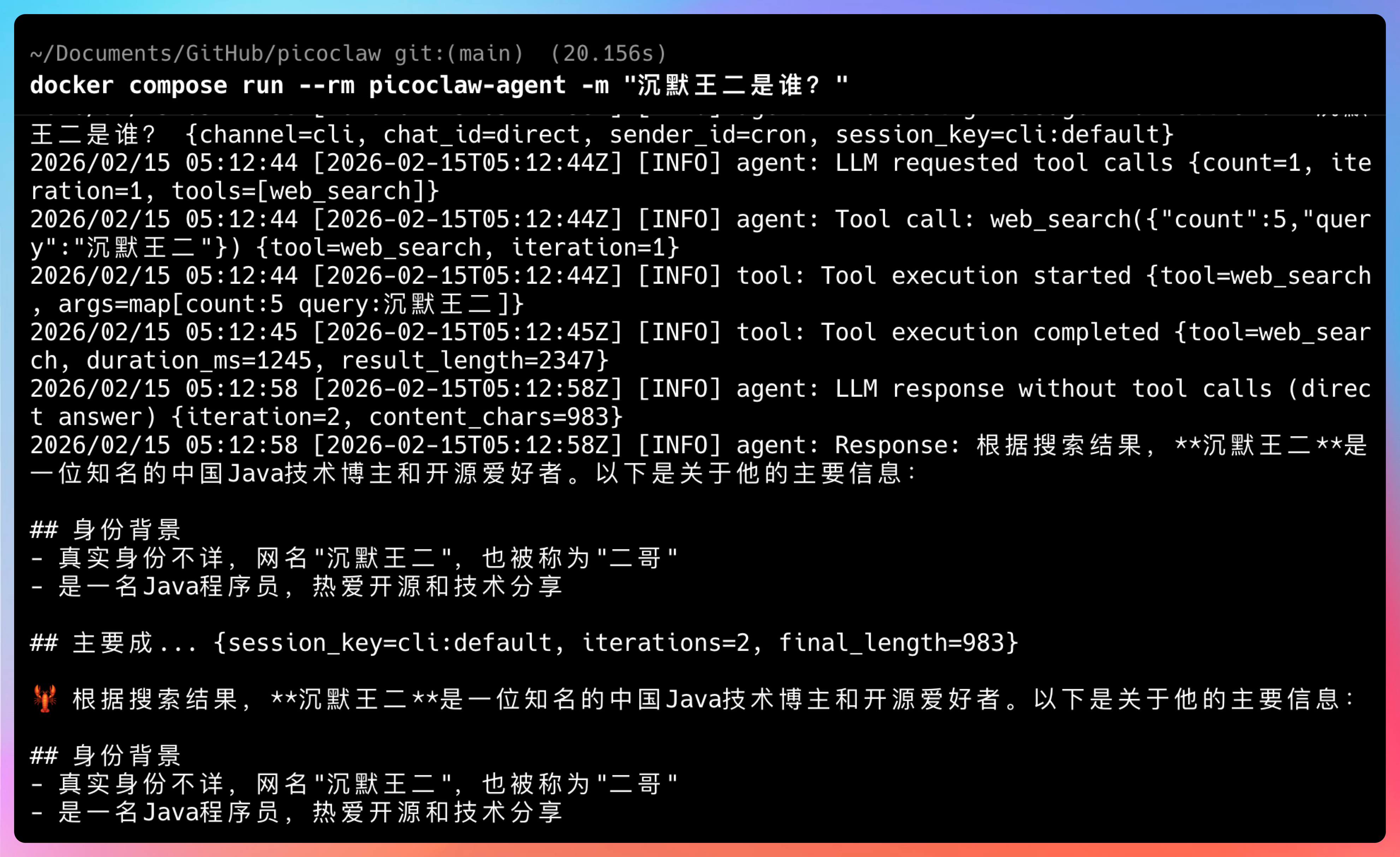 - 完成 PicoClaw 在 Linux 环境下的源码编译与部署,配置智谱 GLM-5 作为底层推理引擎,实现 Agent 对话、网络搜索、定时任务等核心功能