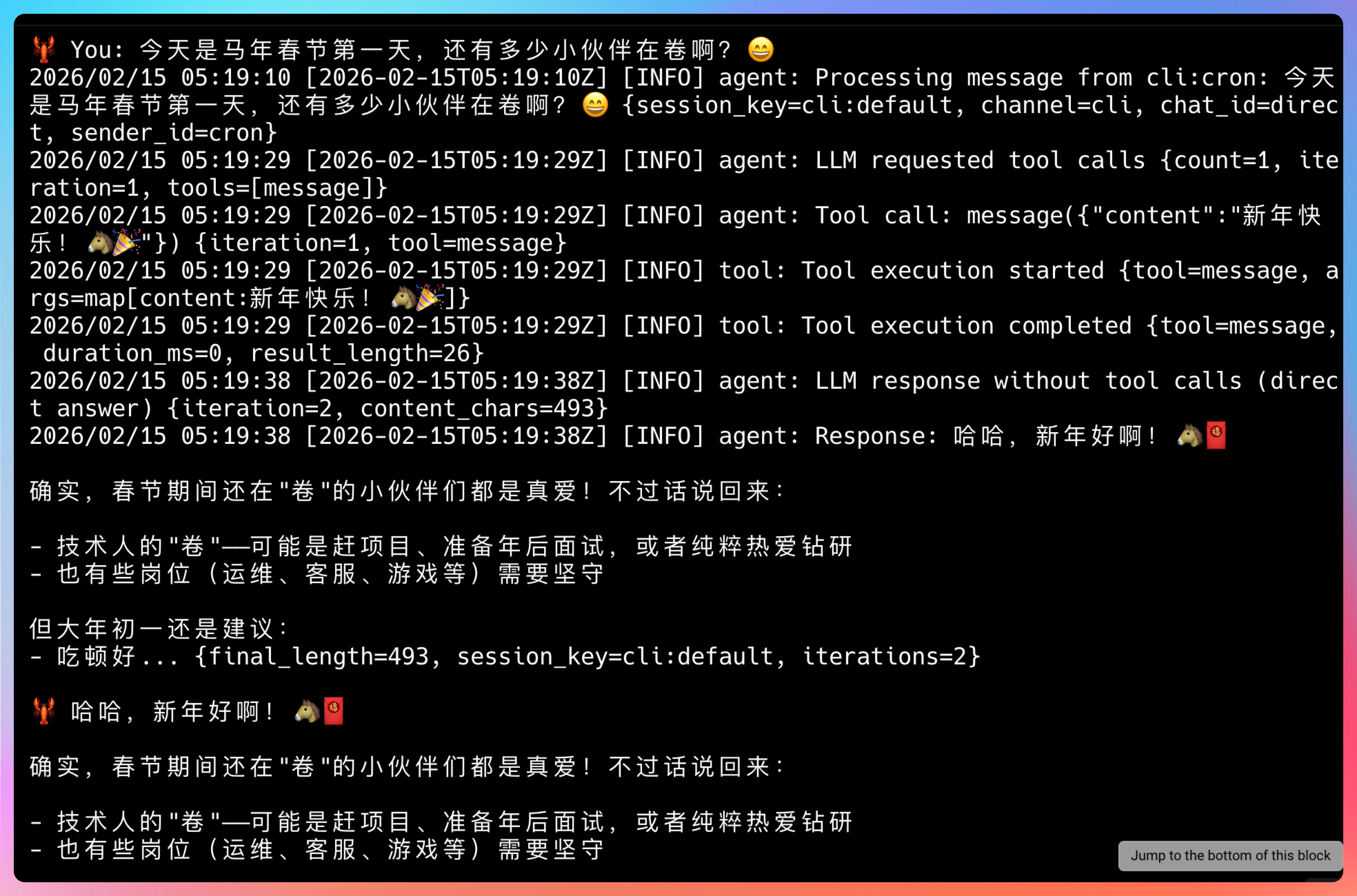 PicoClaw 还有一个很实用的功能:心跳机制。你可以配置一些周期性任务,让 Agent 每隔一段时间自动执行。