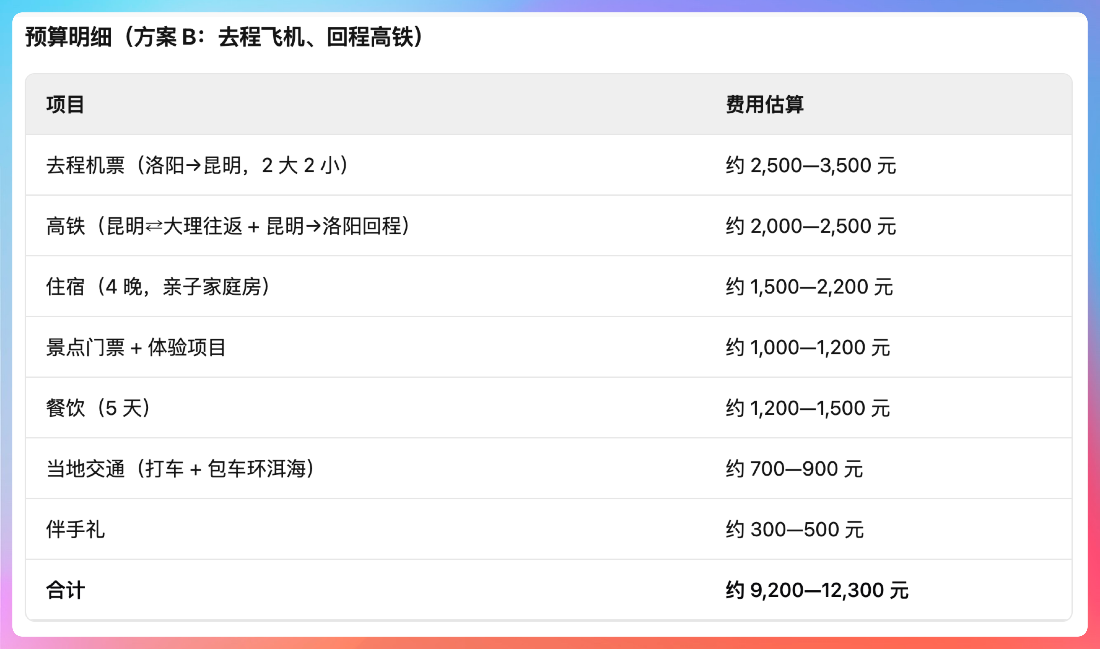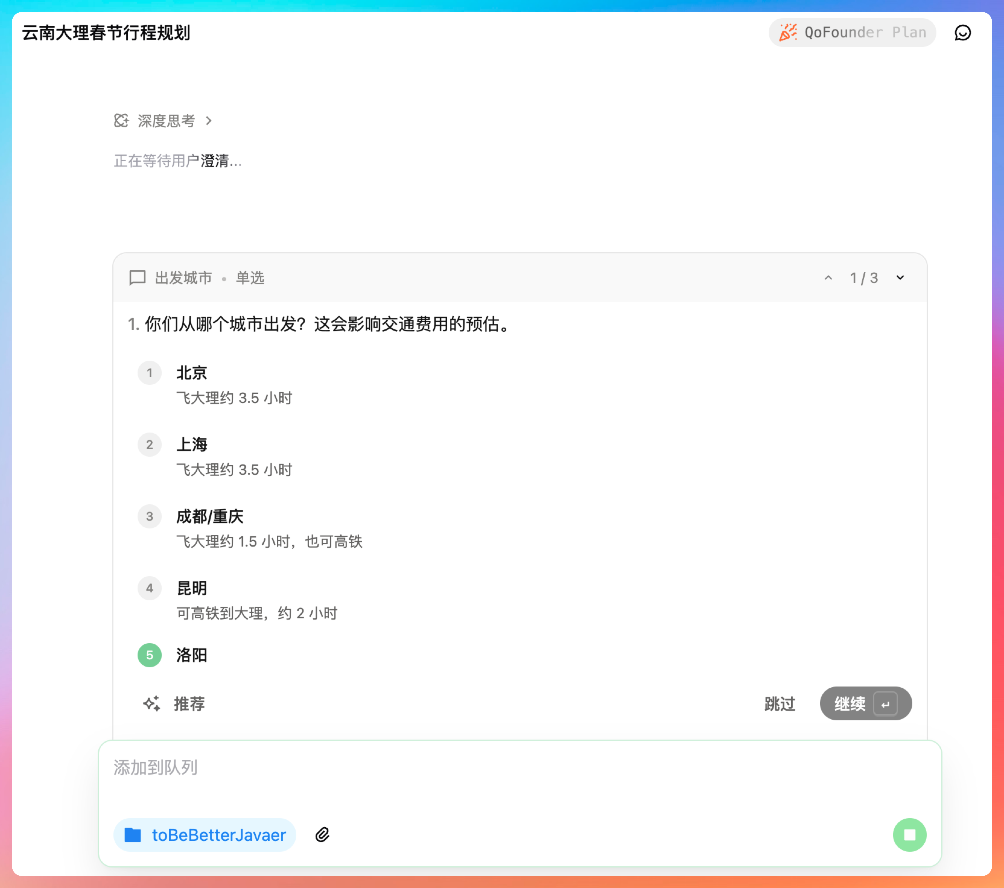 今年我直接把需求扔给 QoderWork:帮我规划春节去云南大理的 5 天行程,家庭出游 4 人,预算 1 万左右。