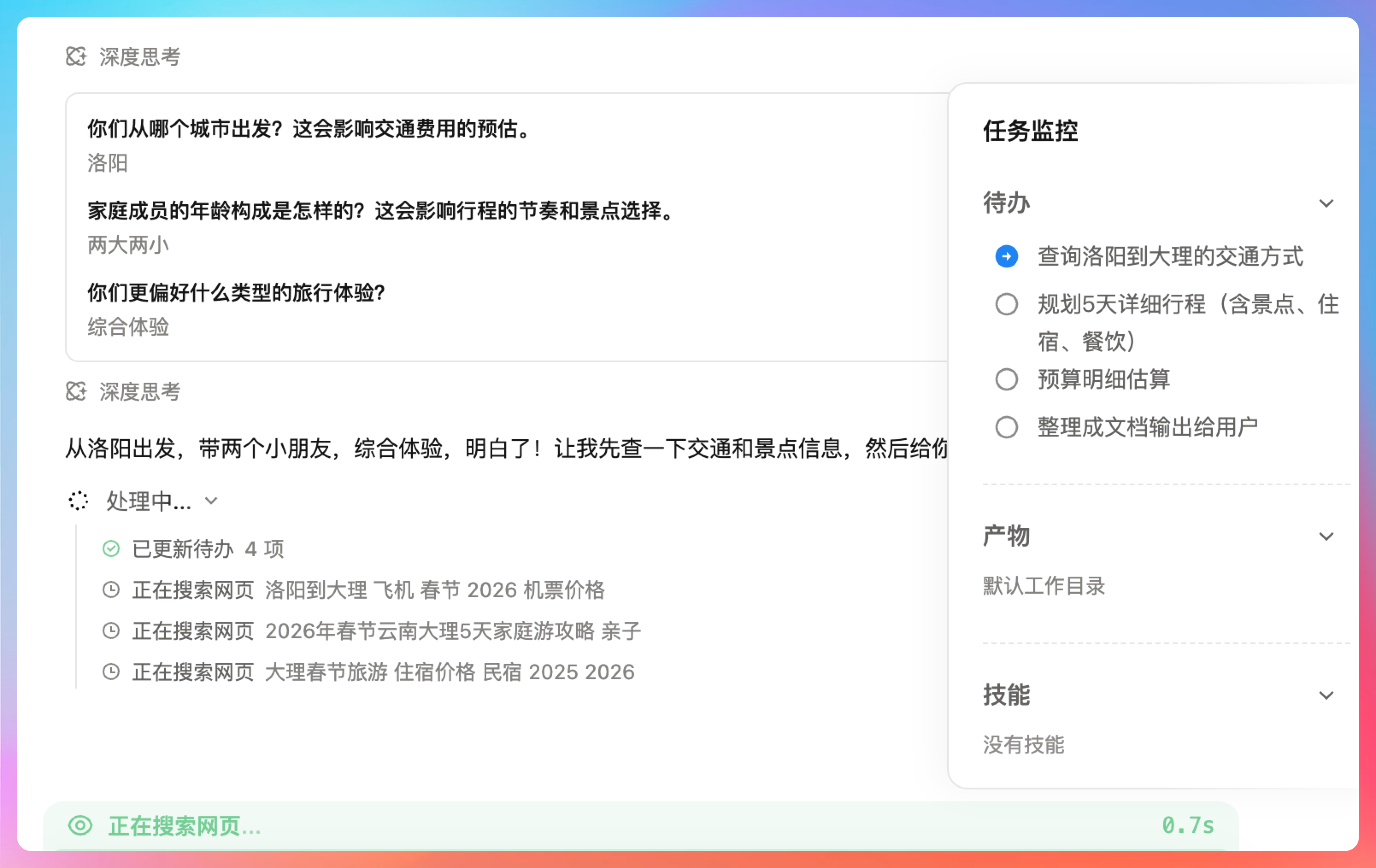 它先问了我几个问题:从哪个城市出发?家庭成员结构?偏好什么样的旅行体验?