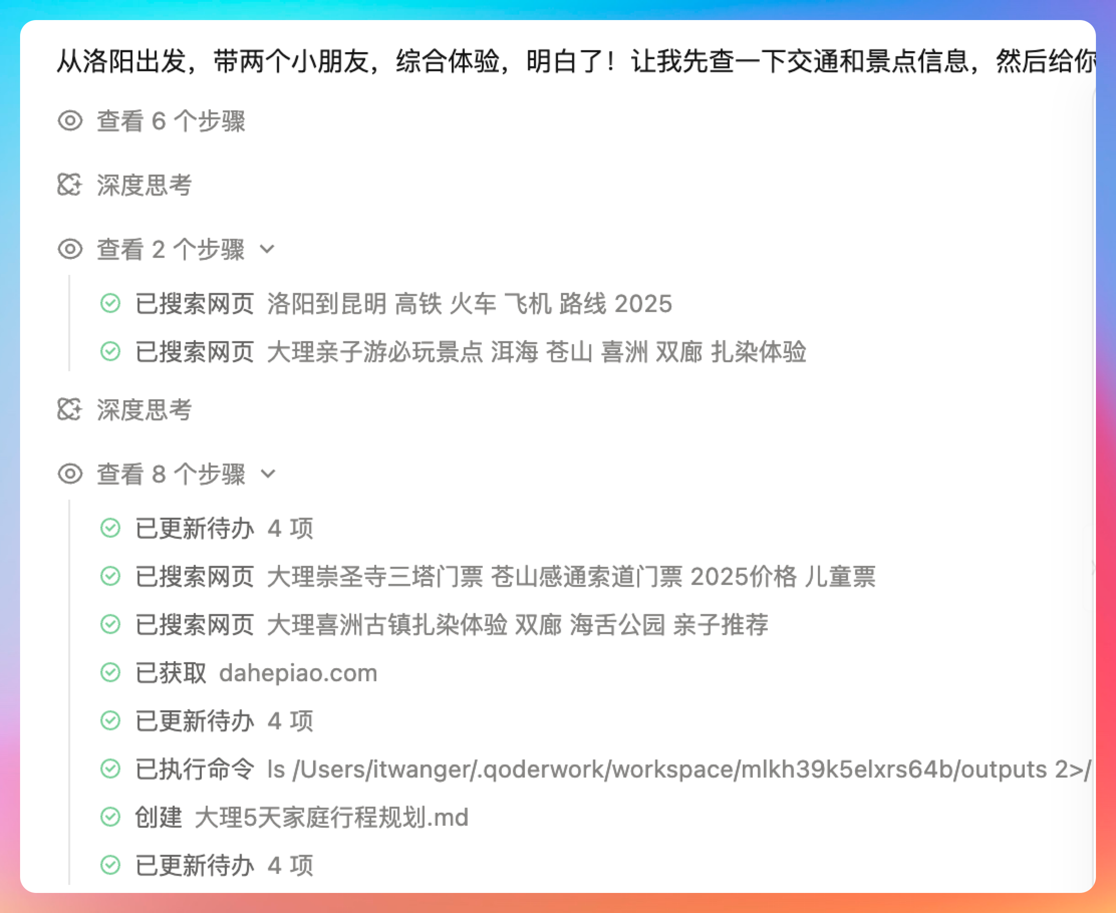 QoderWork会查网页,找出洛阳到昆明的高铁、火车、飞机路线,以及大理的亲子游必玩景点(后面是不是可以直接接入飞猪啊😄),比如说洱海、苍山、喜洲、双廊等。