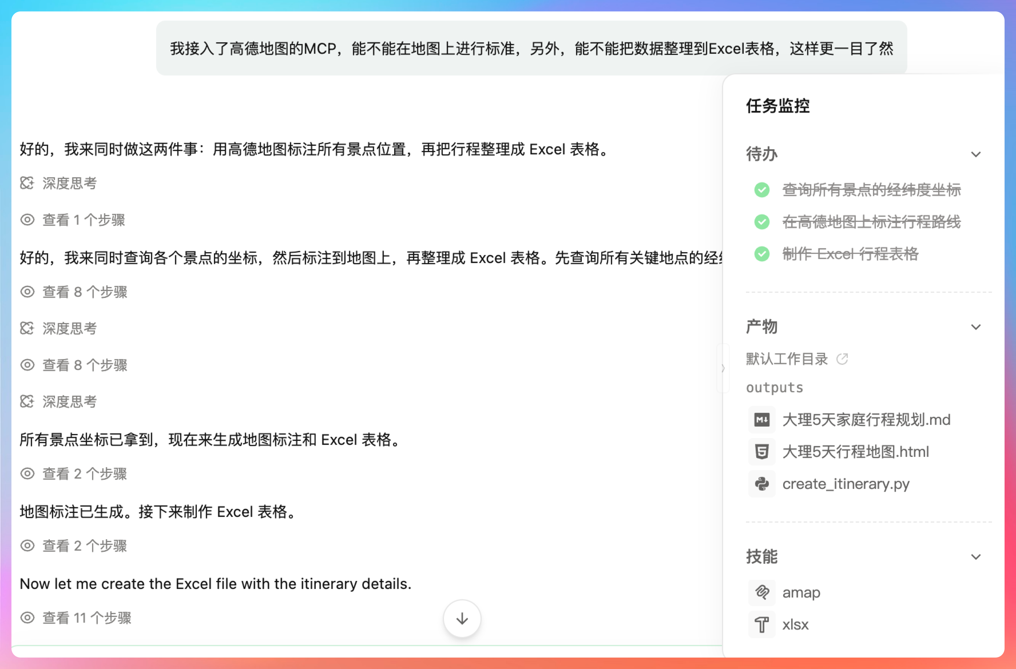 关键是全程没用多少脑细胞,它自己会拆任务、自己会调用工具、自己会生成文件。