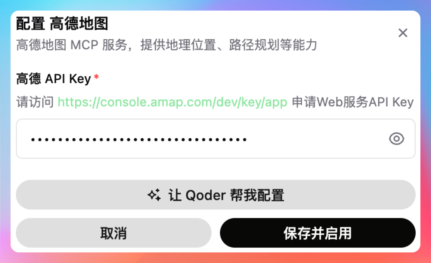 我这里已经绑定了,如果你还没有绑定的话,点设置按钮,跳转到高德地图的开发者平台,申请一个Key,然后填到QoderWork里就行了。