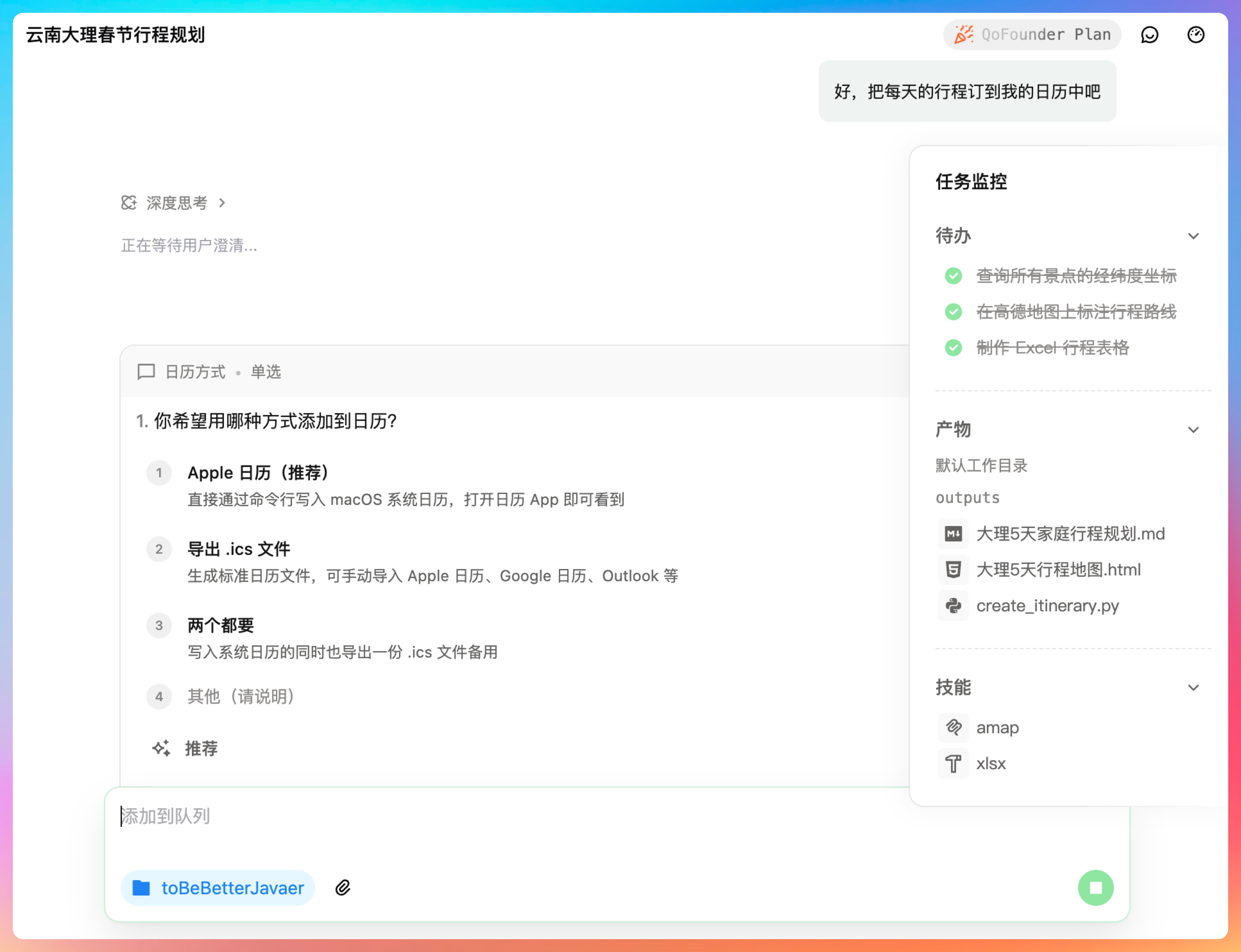 别着急,我们还可以让QoderWork帮我们把行程订到日历中。