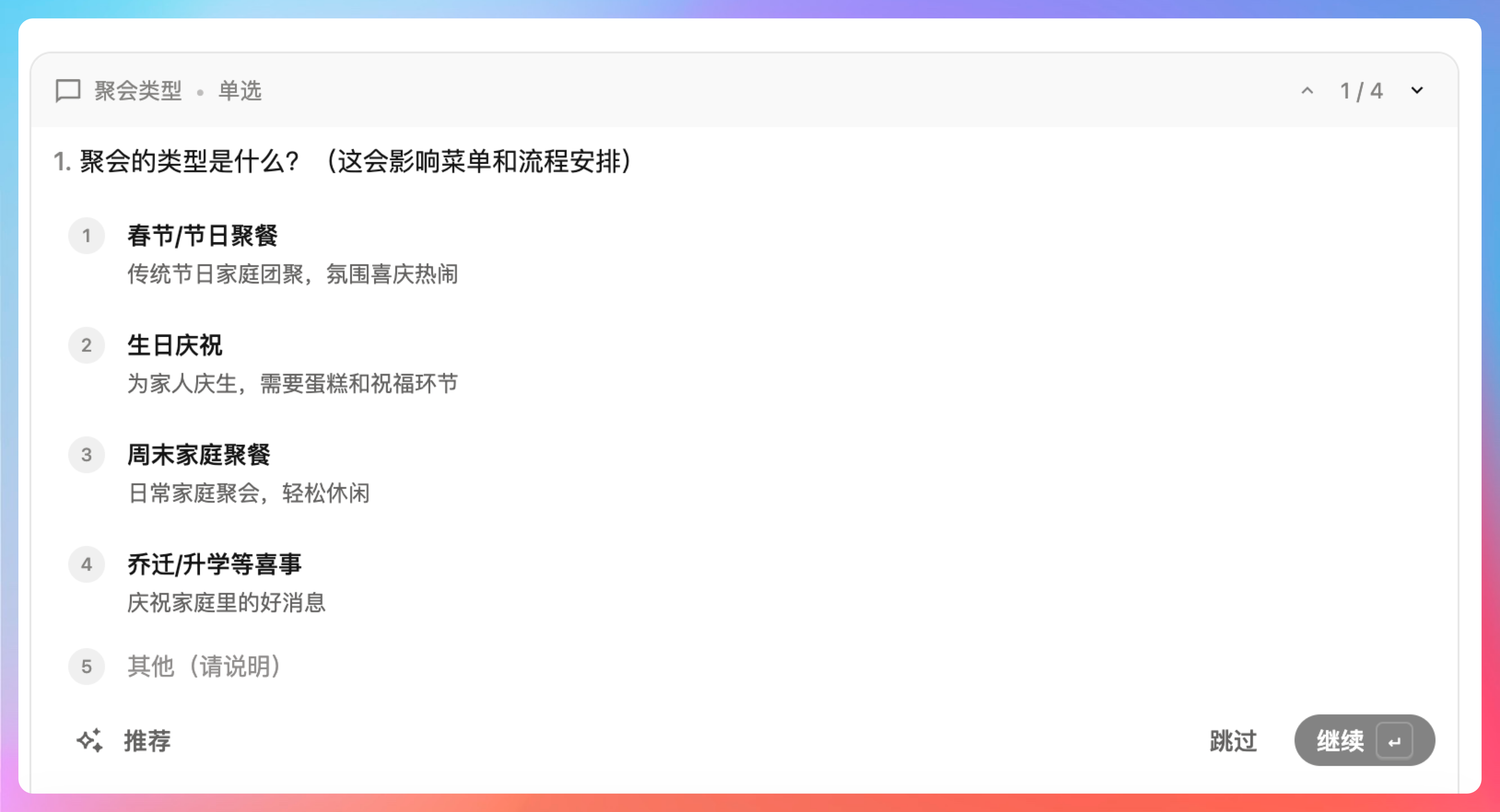 它首先问我:聚会的类型是什么?聚会场地在哪里?20位来宾的大致构成?预算3000元包不包含酒水?