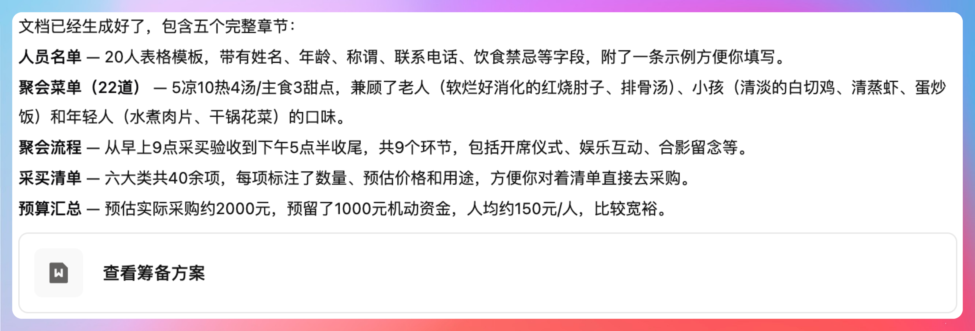 提示词是这样的:帮我筹备家庭聚会,20 人,预算 3000,需要人员名单、菜单、聚会流程、采买清单。