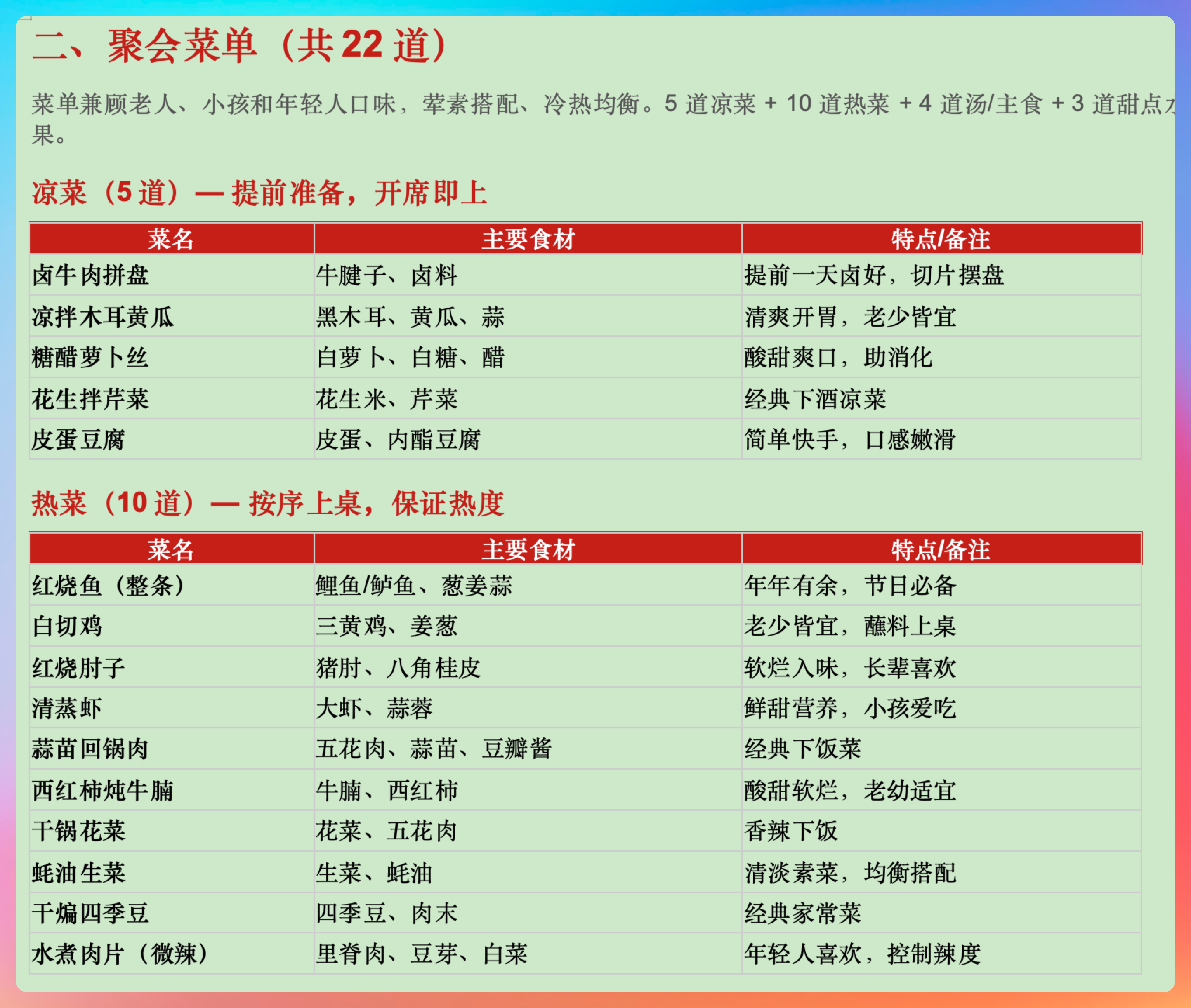 然后是 Word 菜单。不是简单列几个菜名,而是按照荤素搭配、冷热分开的逻辑设计的。每道菜还有寓意说明,比如年年有余的清蒸鲈鱼、团团圆圆的四喜丸子。我妈看了直夸这个菜单有年味儿。