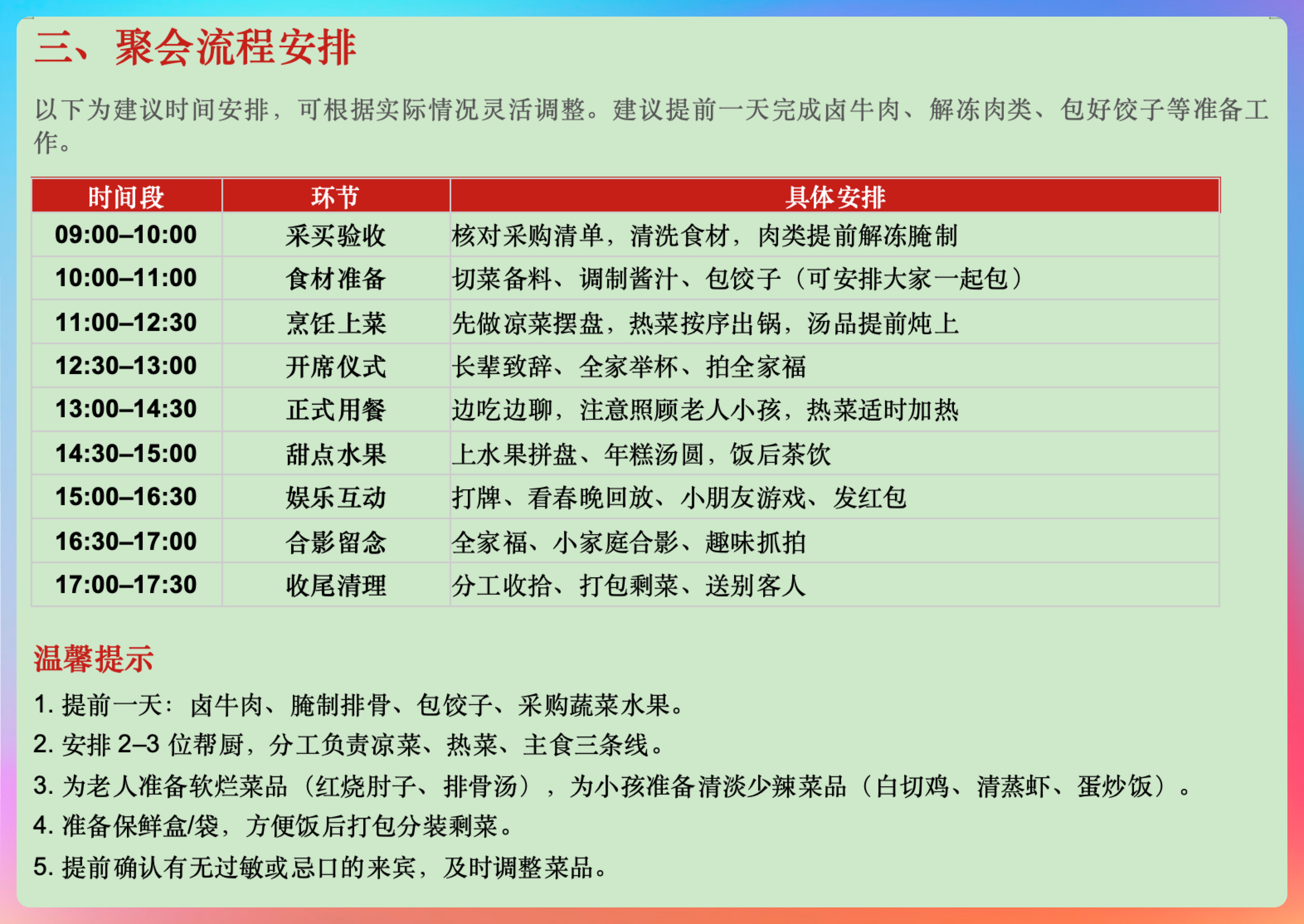 还有聚会流程,你敢信?几点吃饭、开席仪式、游戏环节玩什么、合影时间安排在几点,全都规划好了。