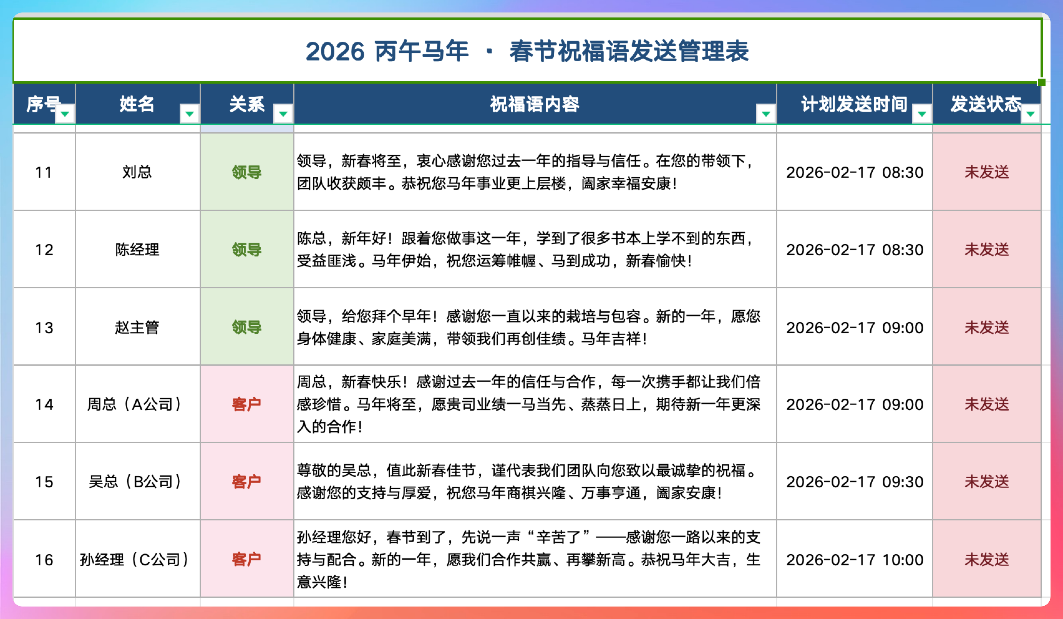 表格里包括:姓名、关系、祝福语内容、计划发送时间、发送状态。到时候照着表发就行,不会漏掉任何一个人,也不会发错内容。