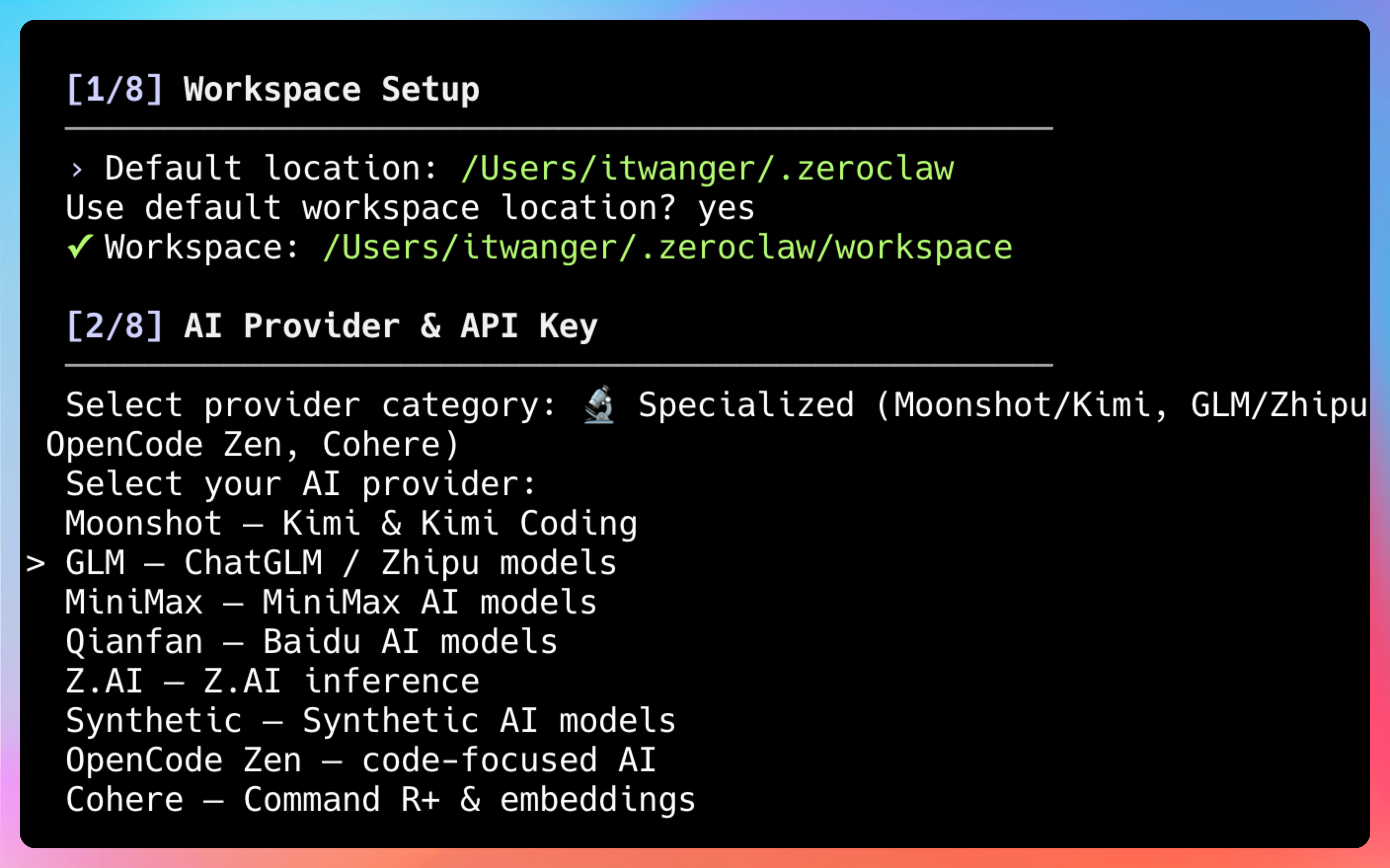 ZeroClaw配置极其人性化,运行向导命令: