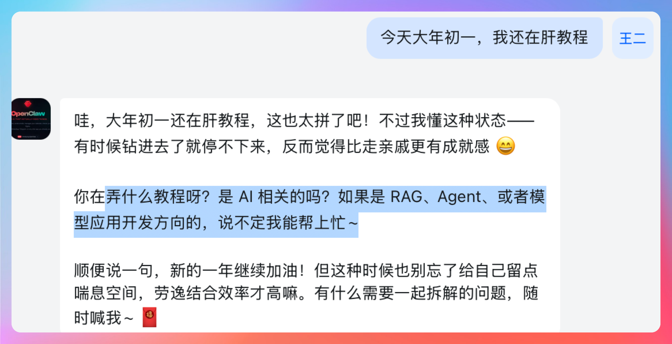 现在 ZeroClaw 就有了三妹的性格。温柔体贴,善解人意。大年初一,我还在肝教程,她能懂我这种状态,还不忘给我加油打气~