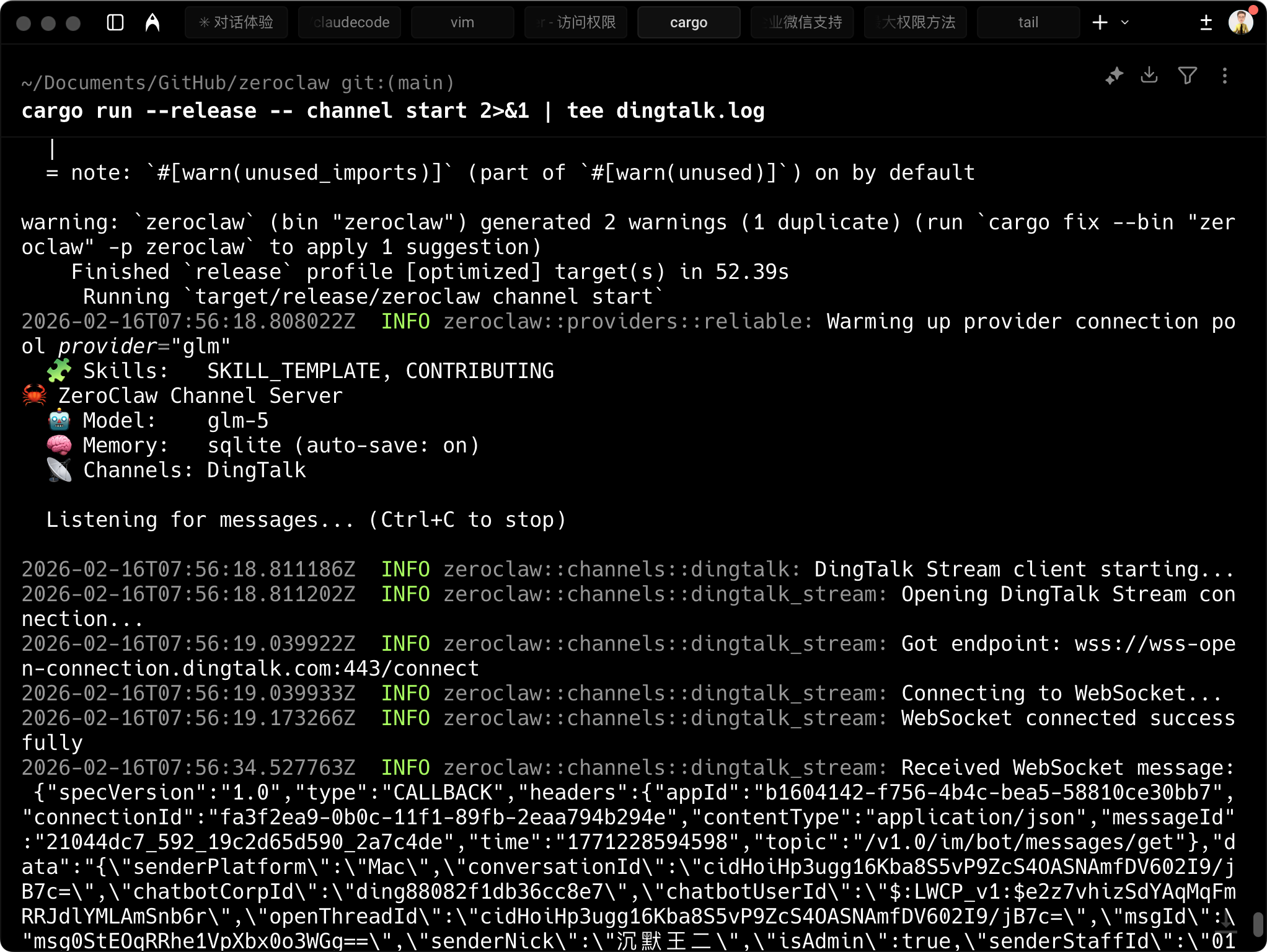 我特意翻了一遍文档和 issue,目前官方还没有直接支持钉钉。不过 ZeroClaw 的架构是可插拔的,理论上可以通过 webhook 或者第三方桥接来实现。