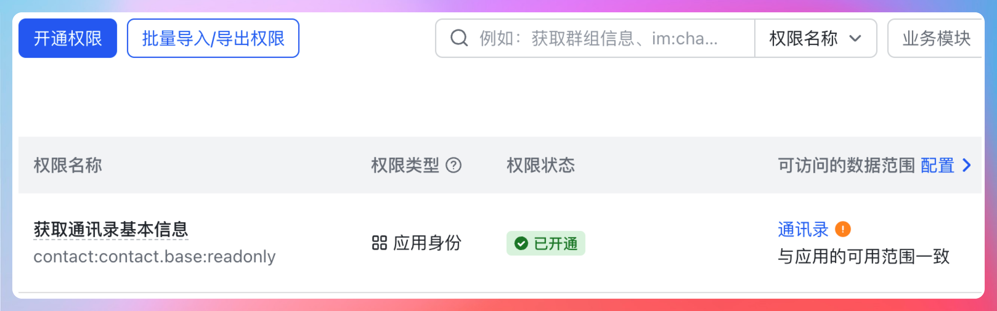 直接在飞书这里添加通讯录基本信息的只读权限。