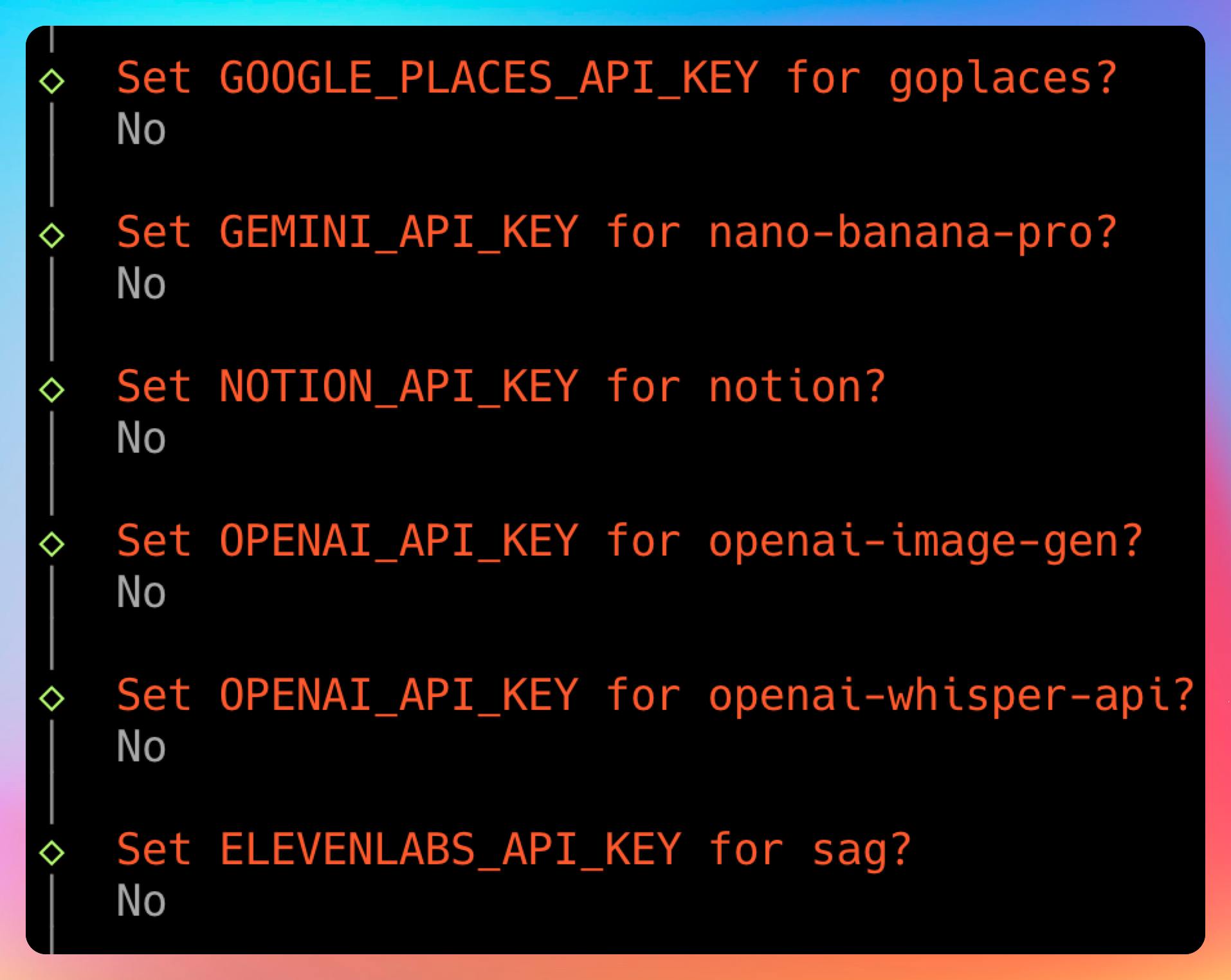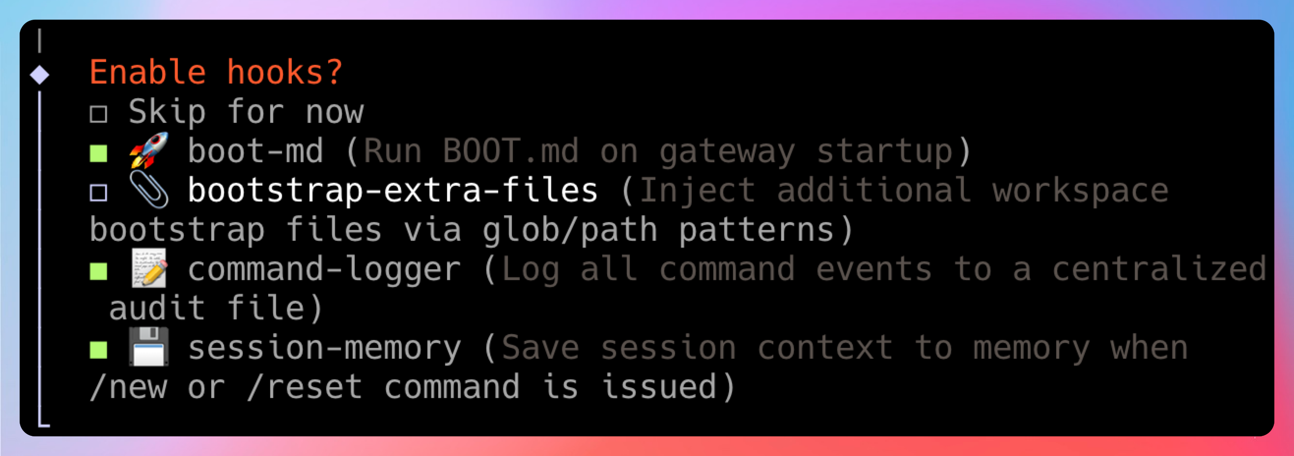 接下来是 hooks 的安装,OpenClaw 目前附带了 3 个自动发现的捆绑 hooks,其中 session-memory 用于当你发出 /new 时将会话上下文保存到智能体工作区;command-logger 将所有命令事件记录到 commands.log 中;boot-md 当 Gateway 网关启动时运行 BOOT.md。