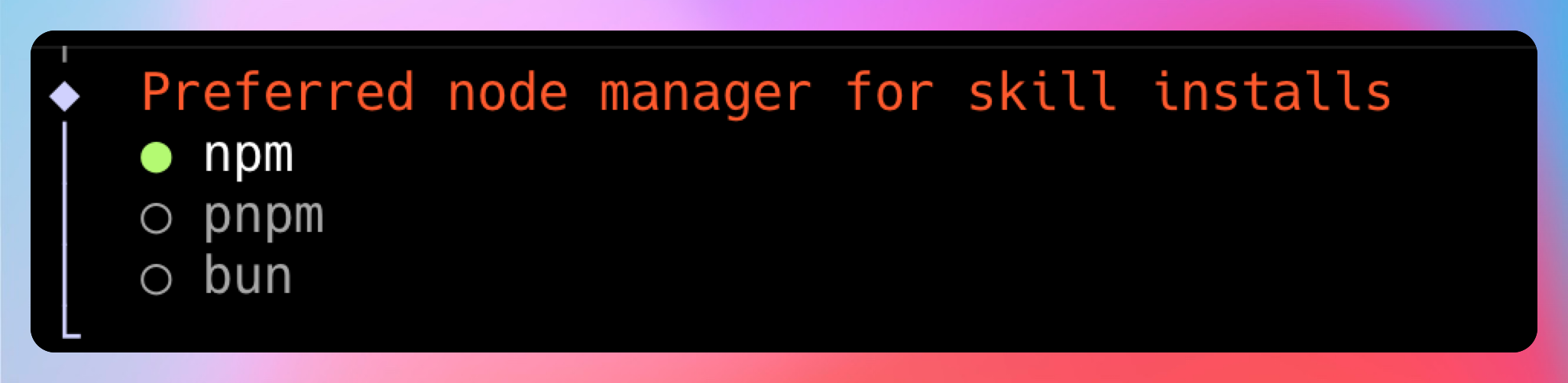 接下来选择 Skills 的安装方式。默认 npm 就行。