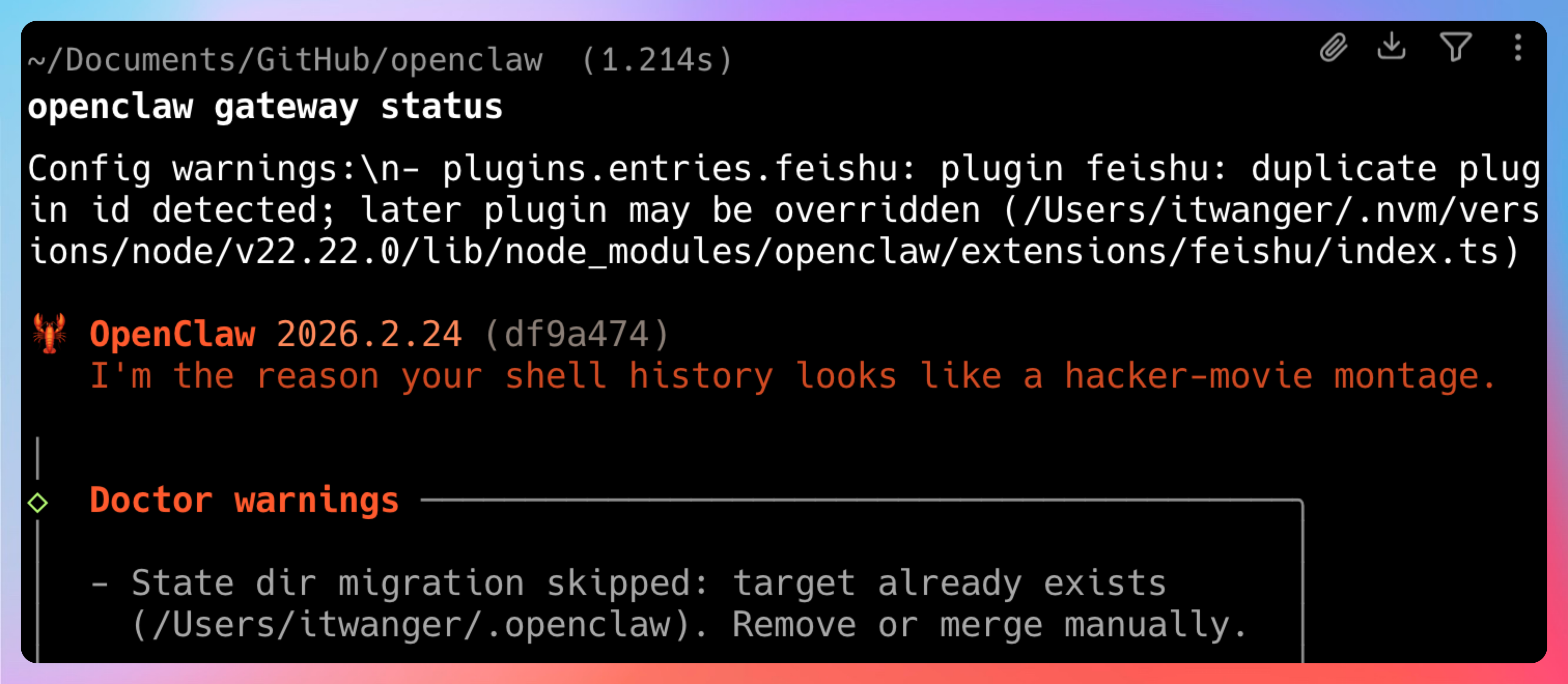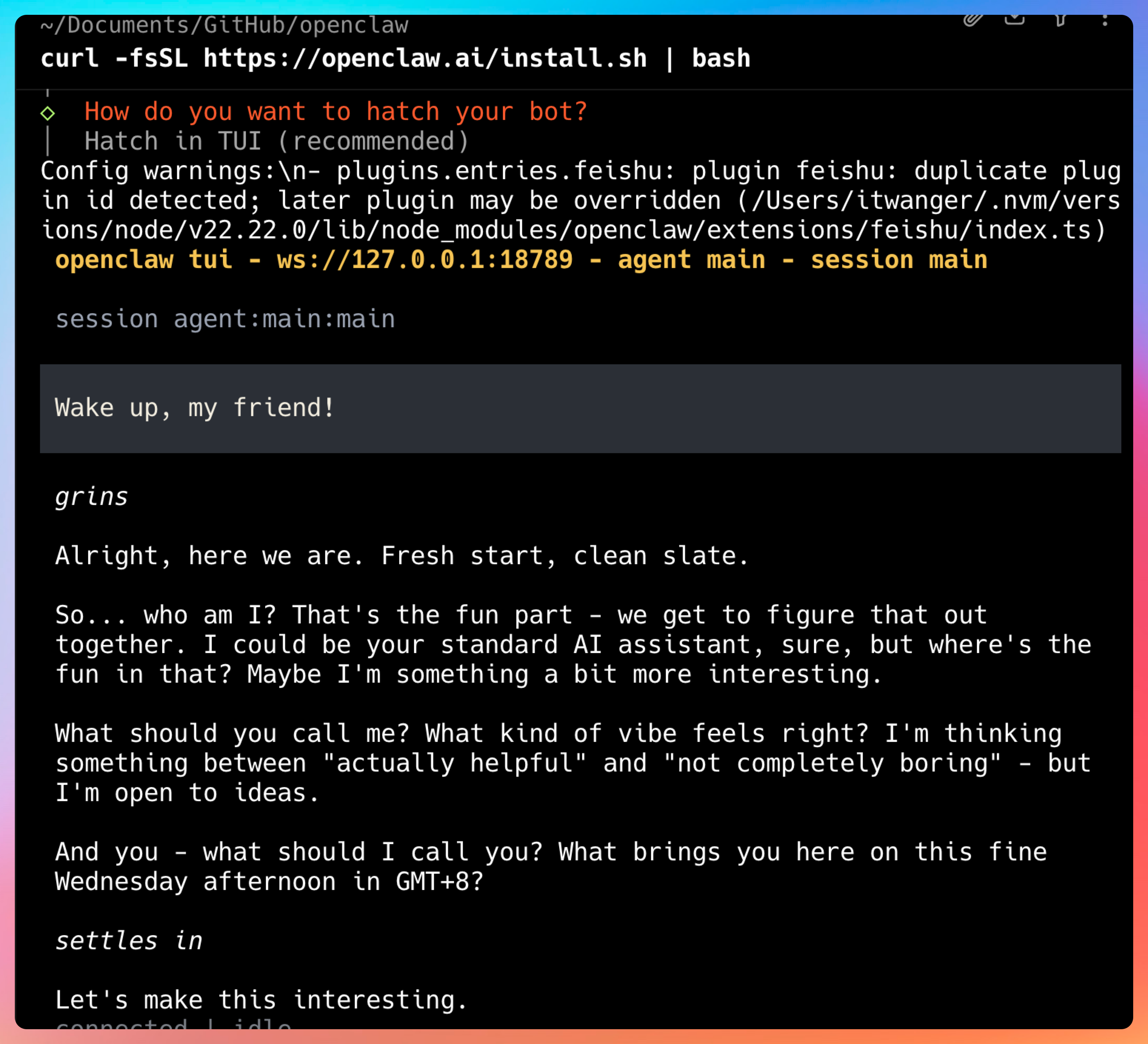 这个命令会启动 OpenClaw 的网关服务,默认监听 18789 端口。
