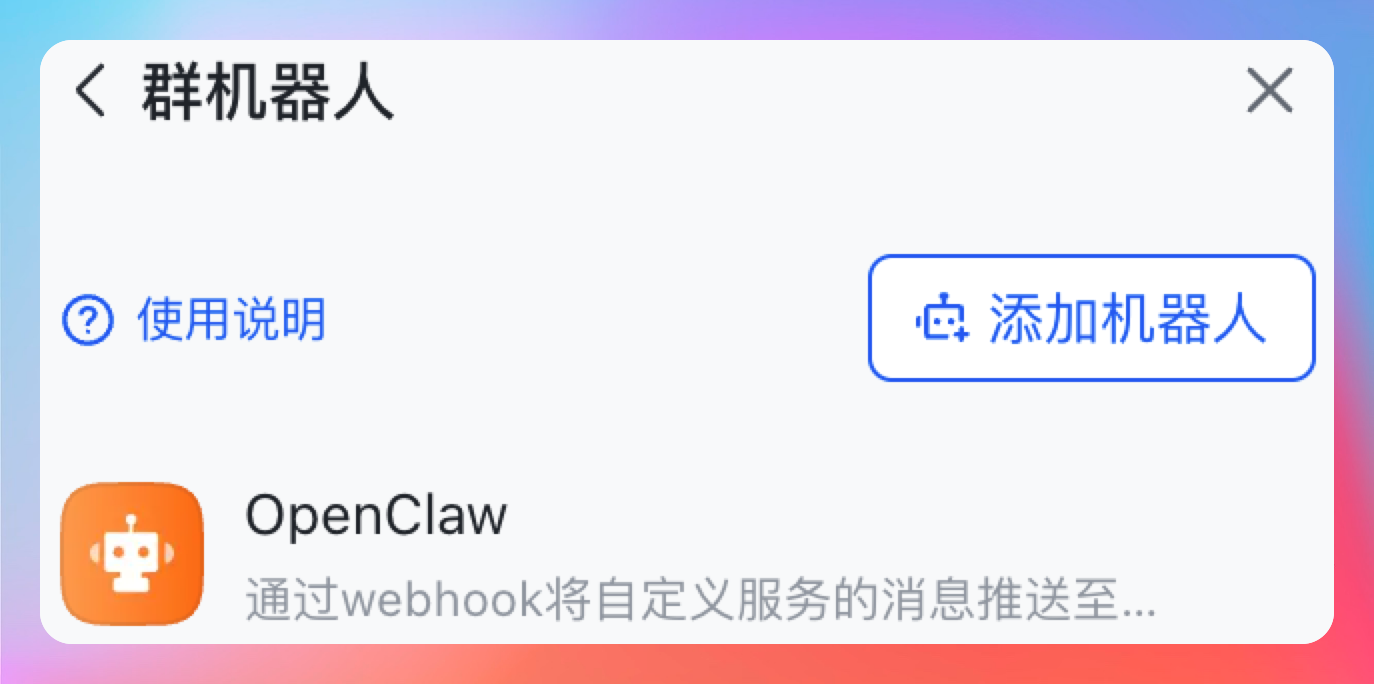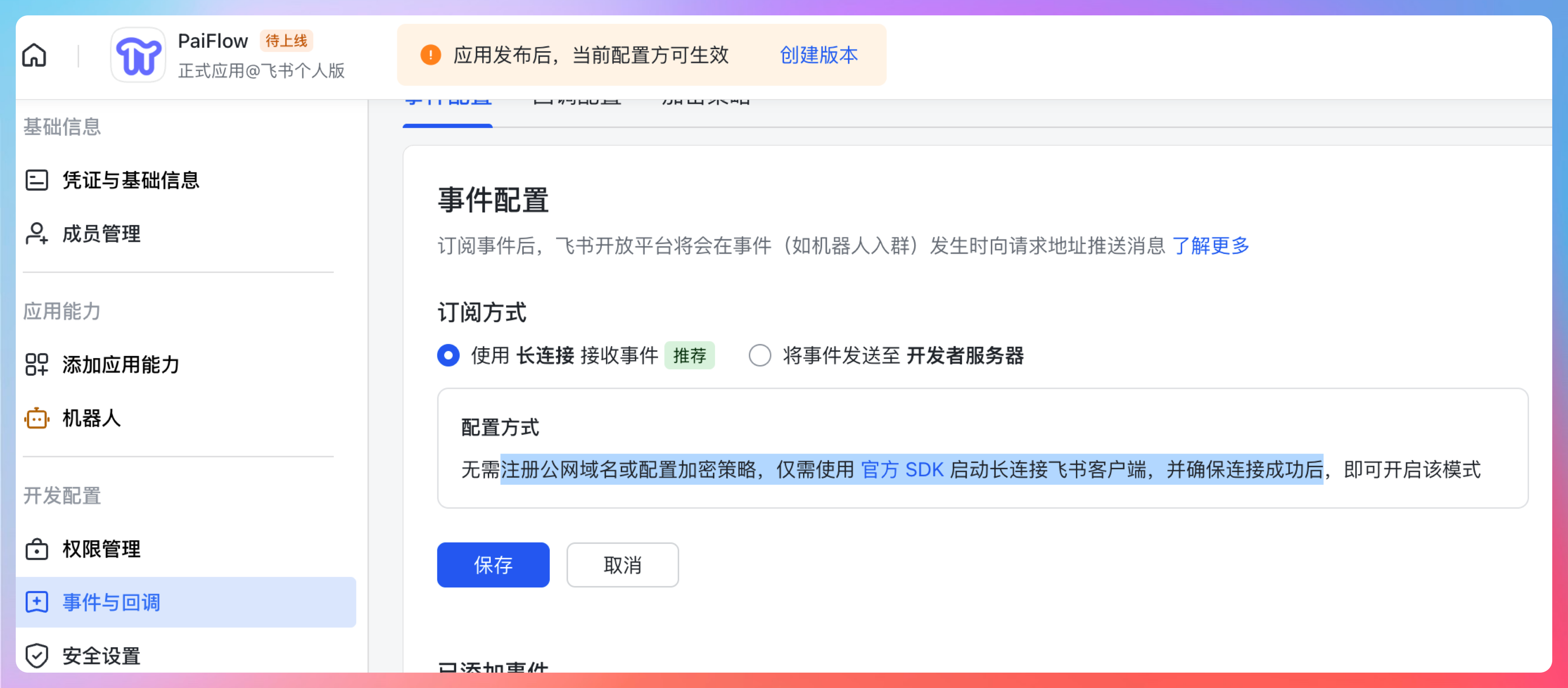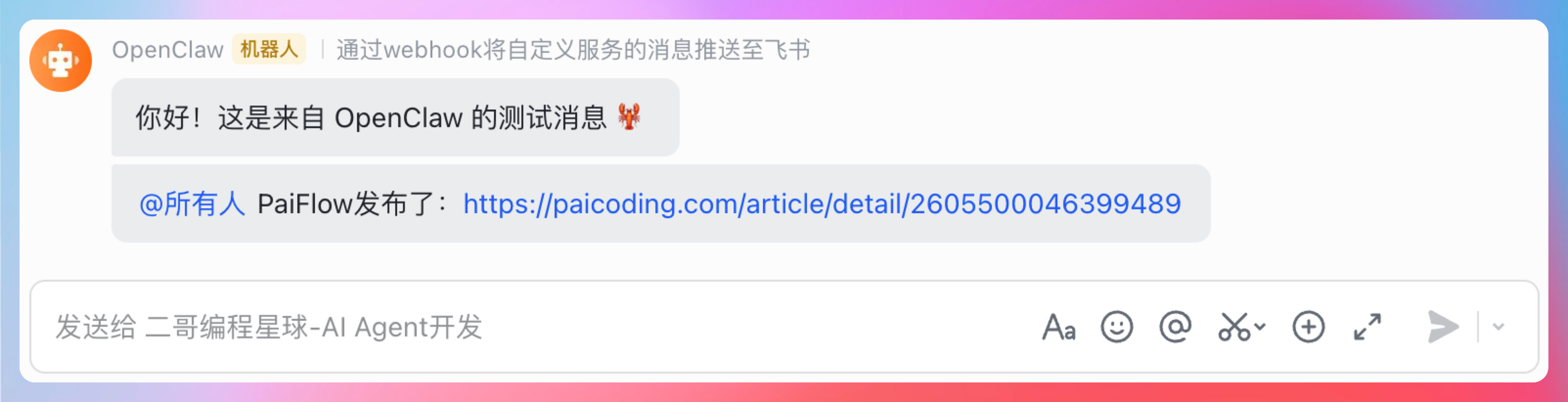 比如说 PaiFlow 发布了,我们可以在飞书群里新增一个机器人。